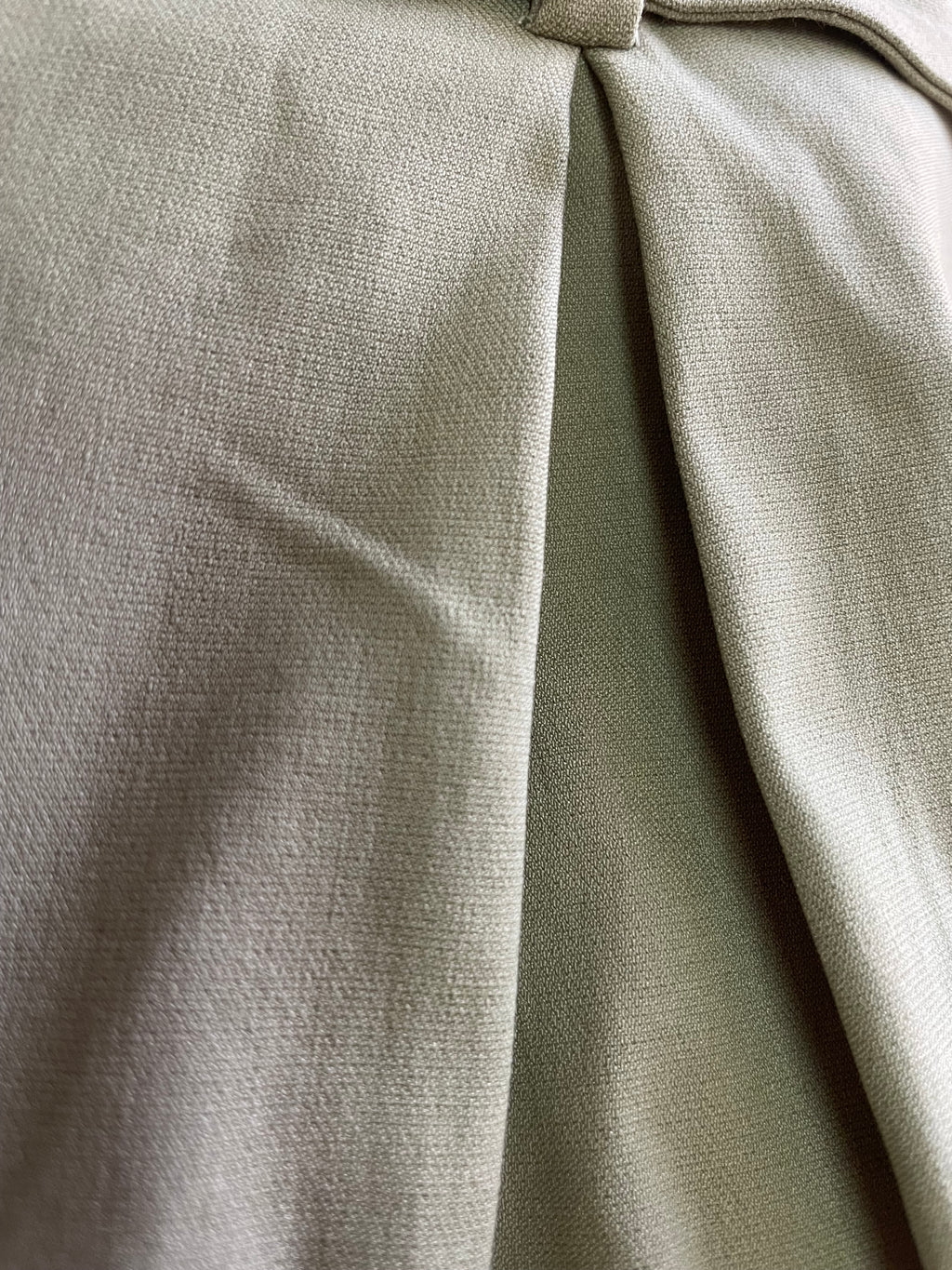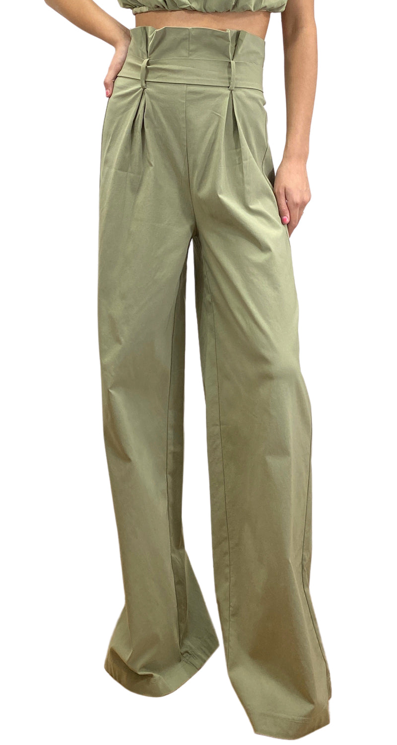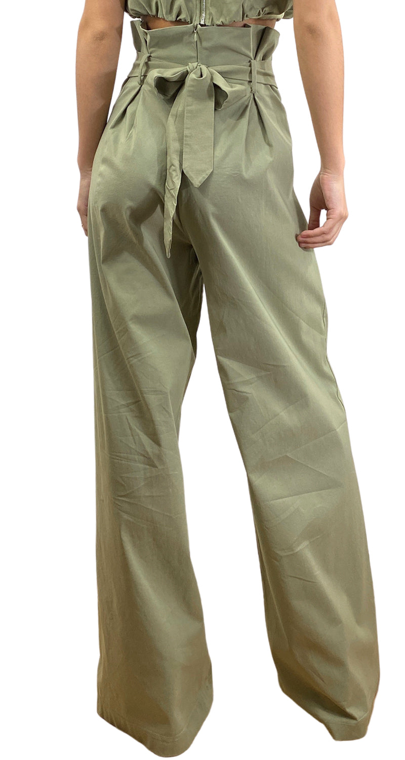 Pantalón estilo Palazzo en color Verde, sin bolsillos, con lazo en cintura y pinzas en delantero. Altura de modelo 1,70