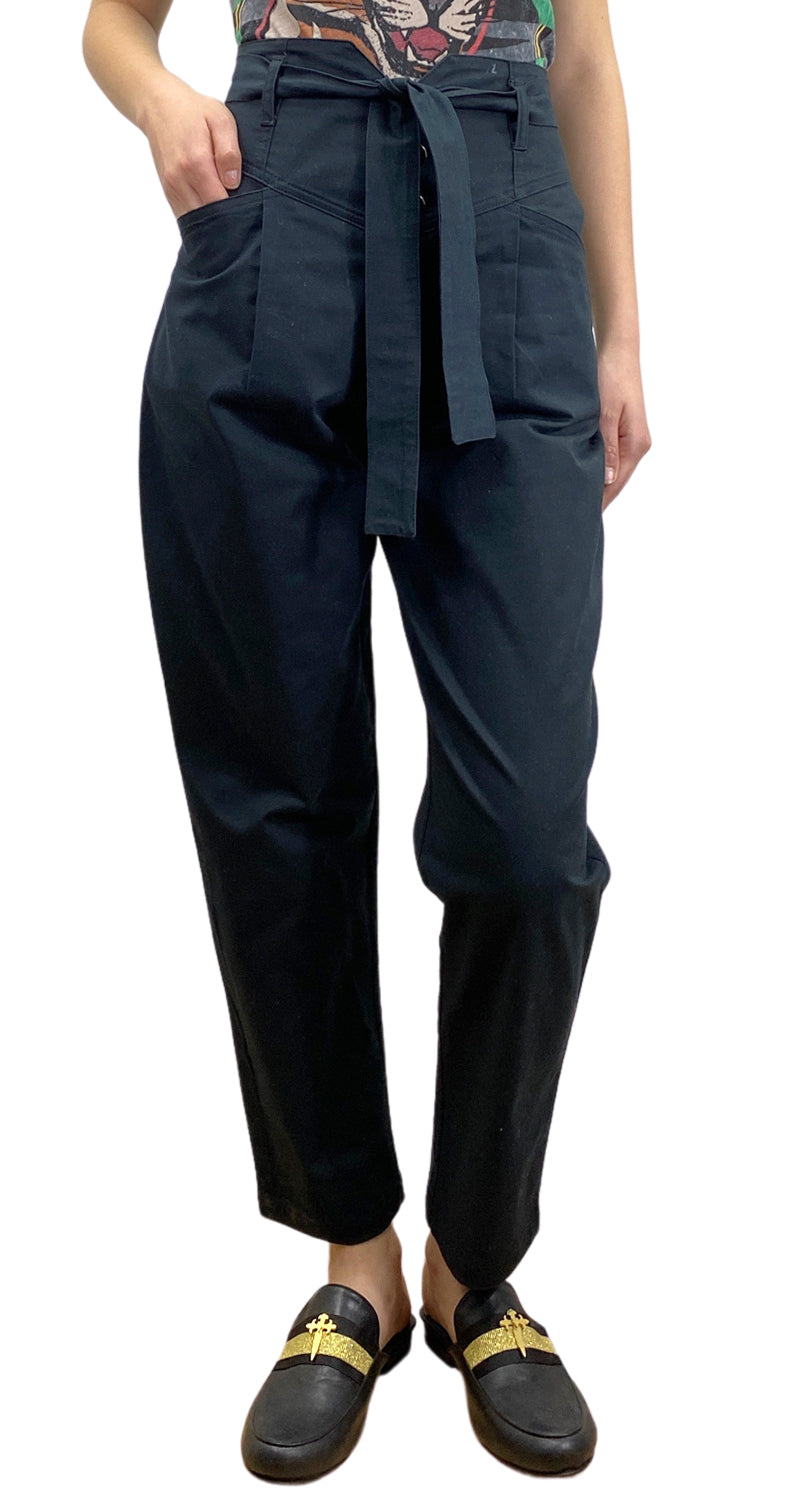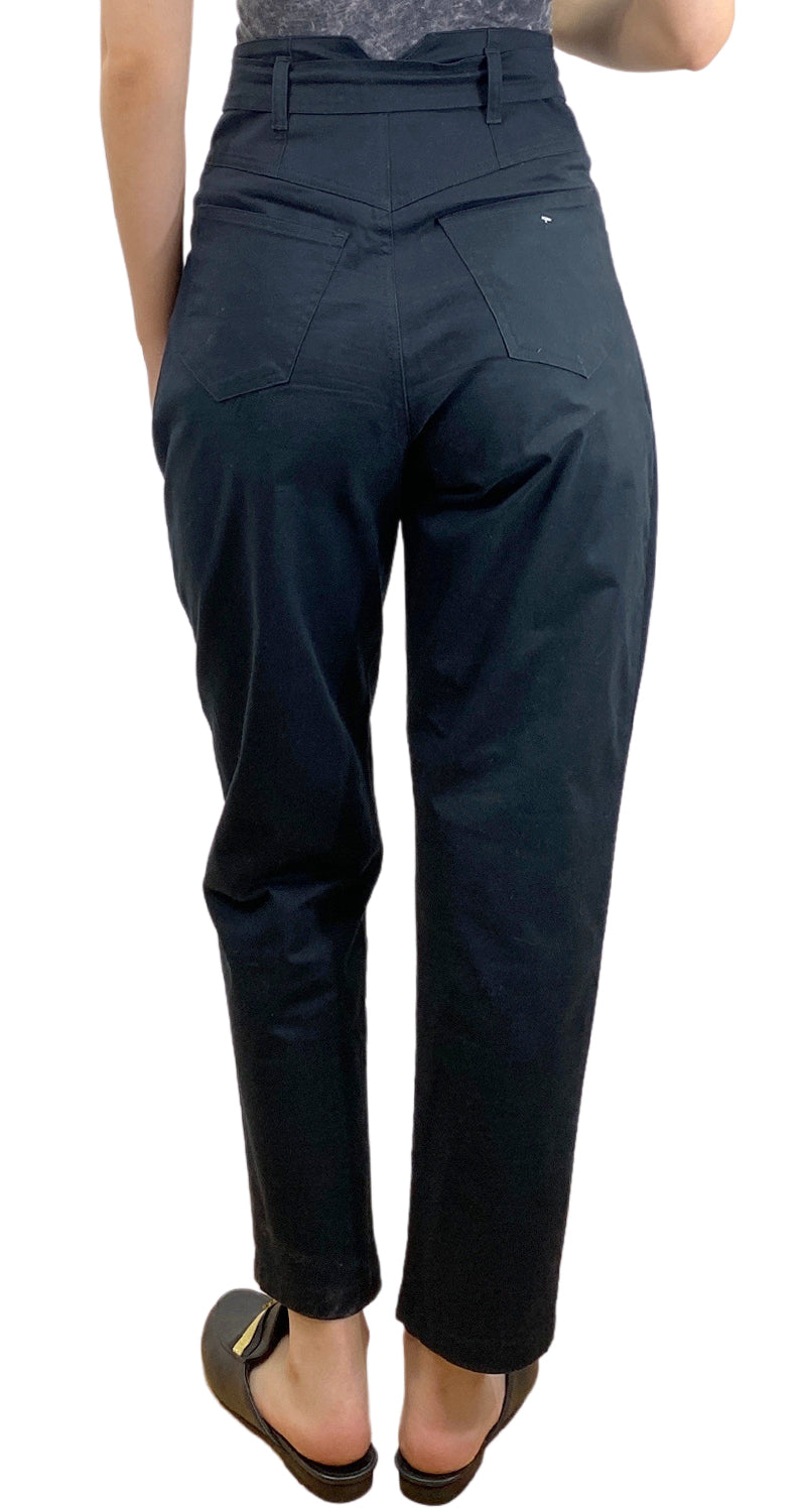 Pantalón color Negro de tela con cinturón, 3 botones frontales modelo 4 bolsillos. Altura modelo 1.68.