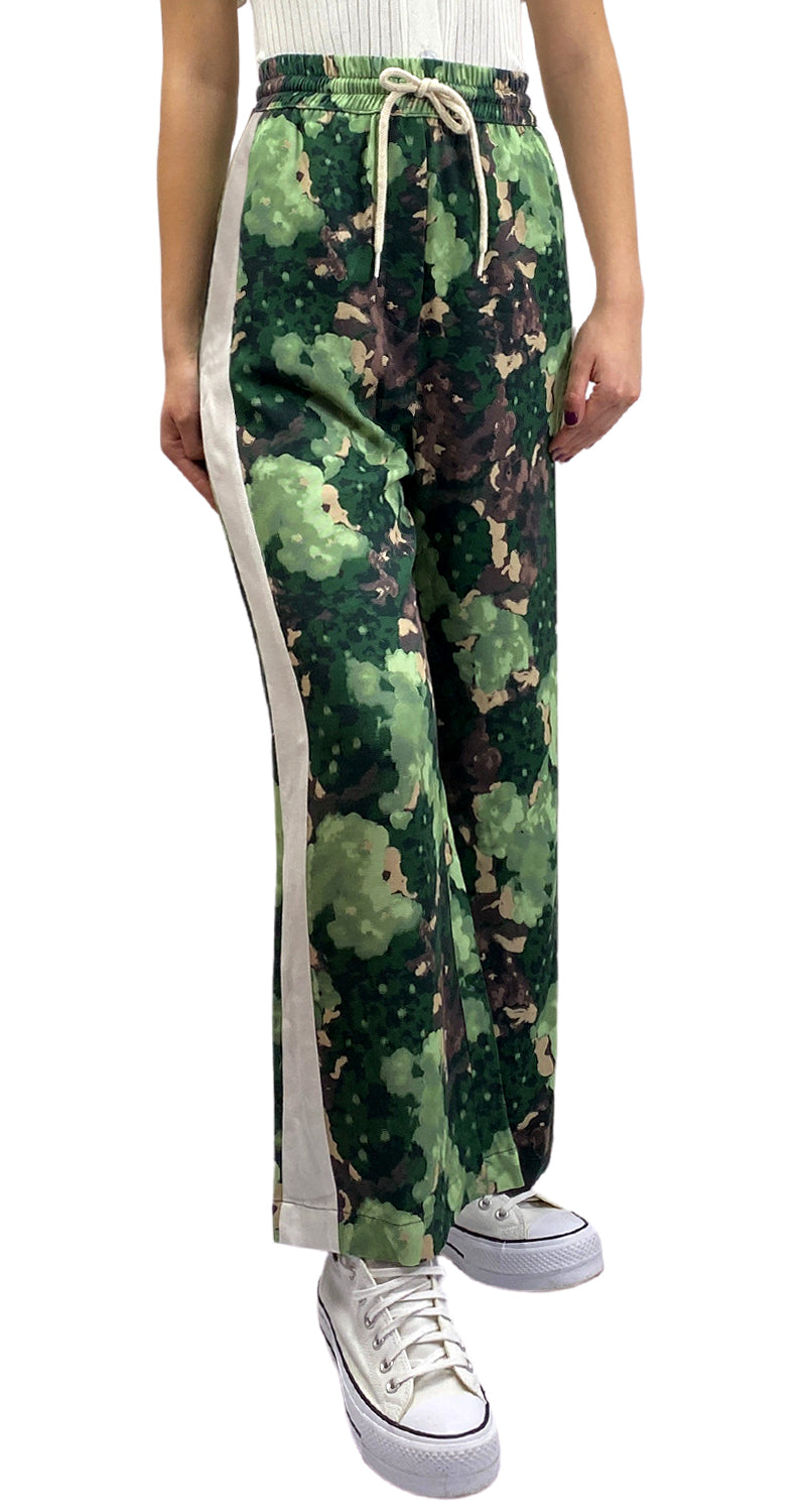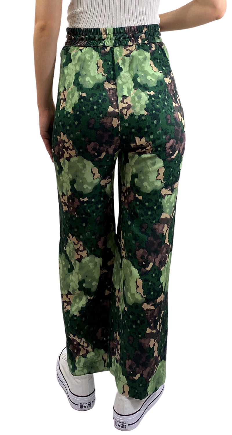 Pantalón Verde de tela con estampado, pretina elasticidad y cordones ajustables. Talla 1 de la marca. Altura modelo 1.68.
