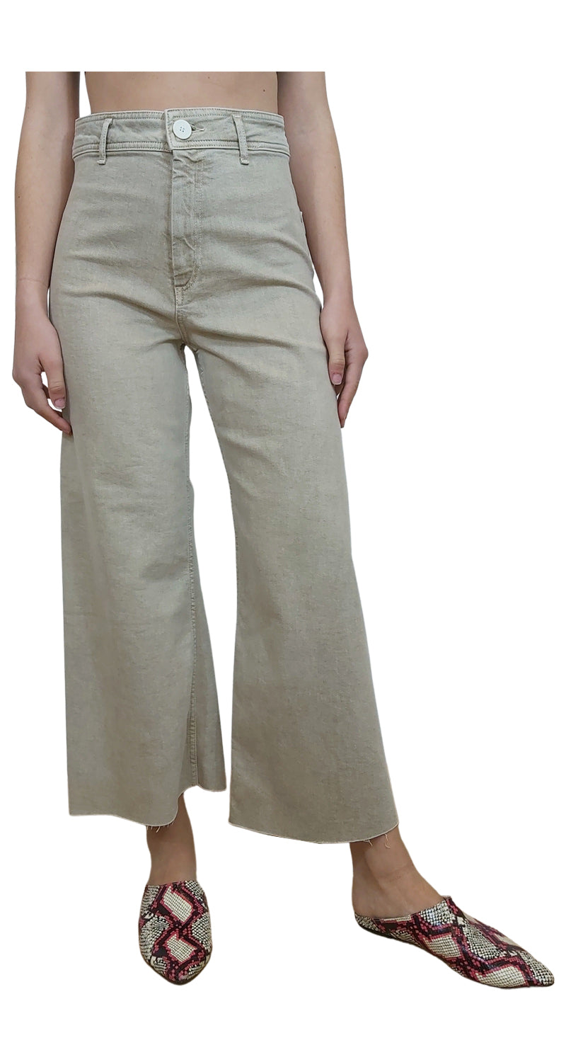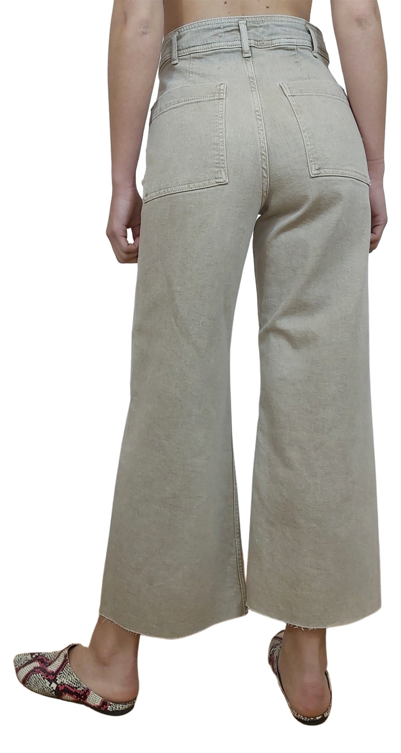 Pantalón Denim color Beige, tiro alto, estilo palazzo, bolsillos en trasero y ruedo desflecado.