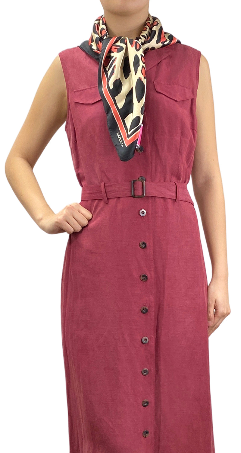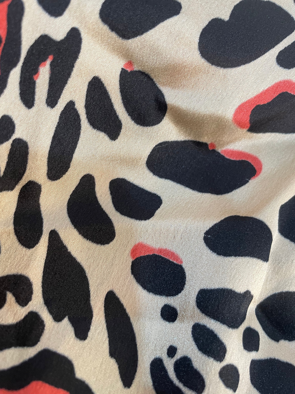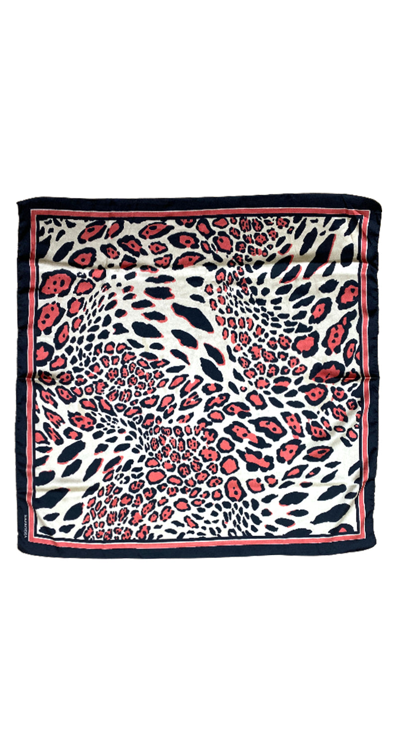 Pañuelo con estampado Animal Print en tonos Café, Coral y Negro, bordes color Negro. Medidas: 77 x77 cm.