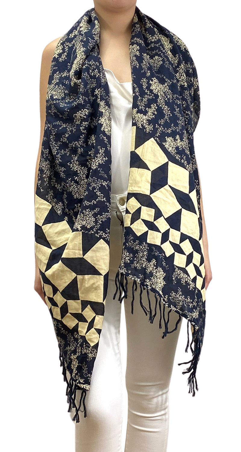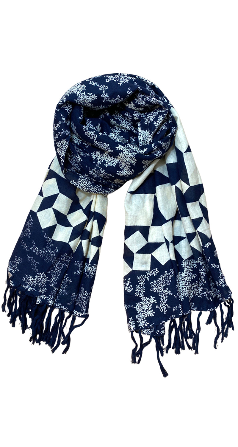 Pañuelo Color Azul con estampados color Beige y flecos en borde. Medias 180x90 cm aprox.