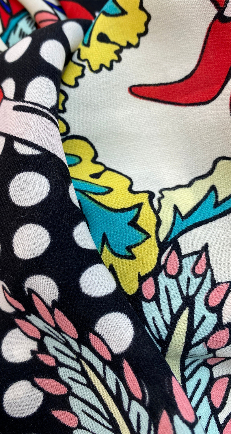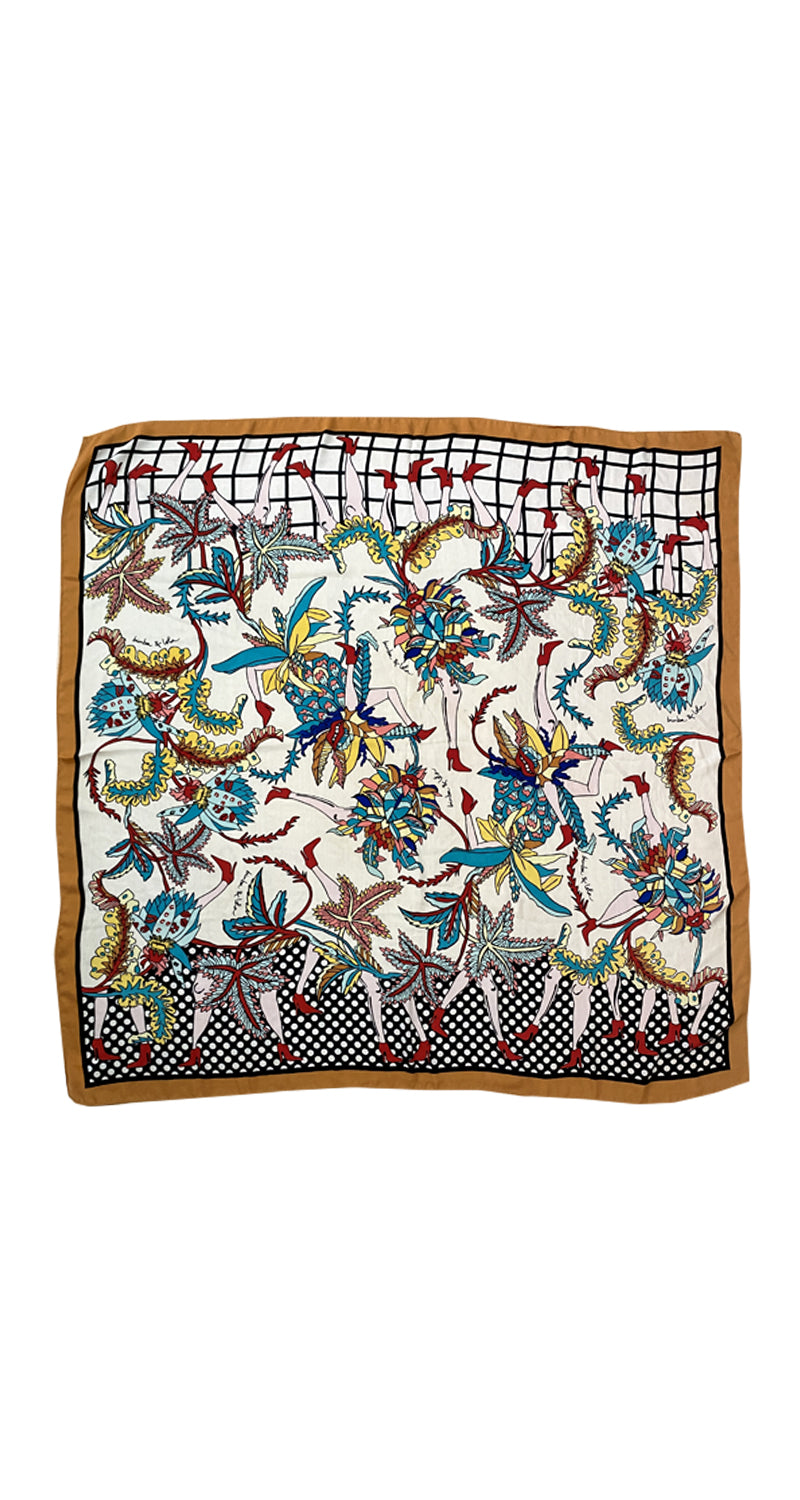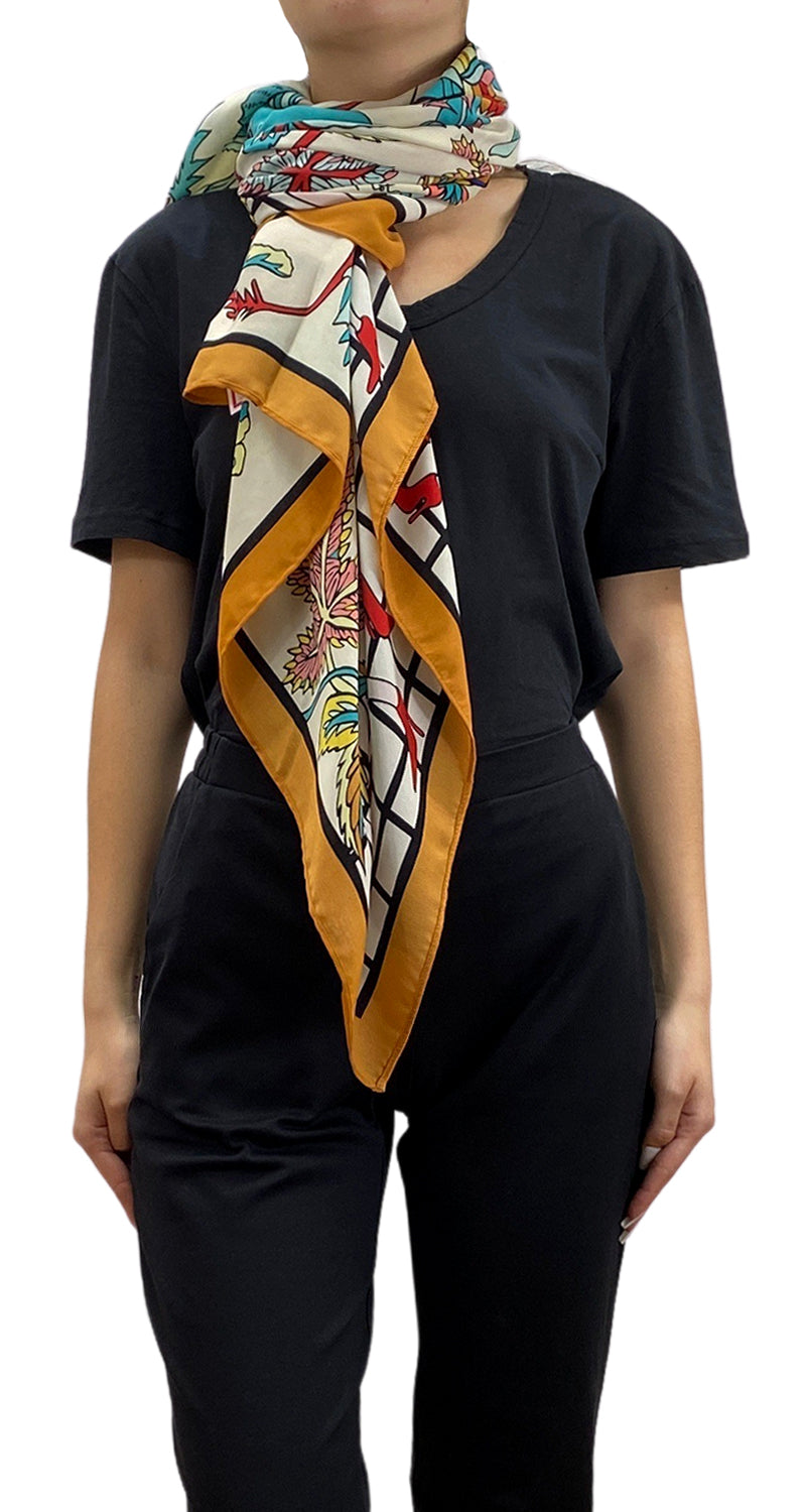 Pañuelo color Blanco de bordes naranjos y estampado Multicolor. Medidas: 120 cm x 120 cm.