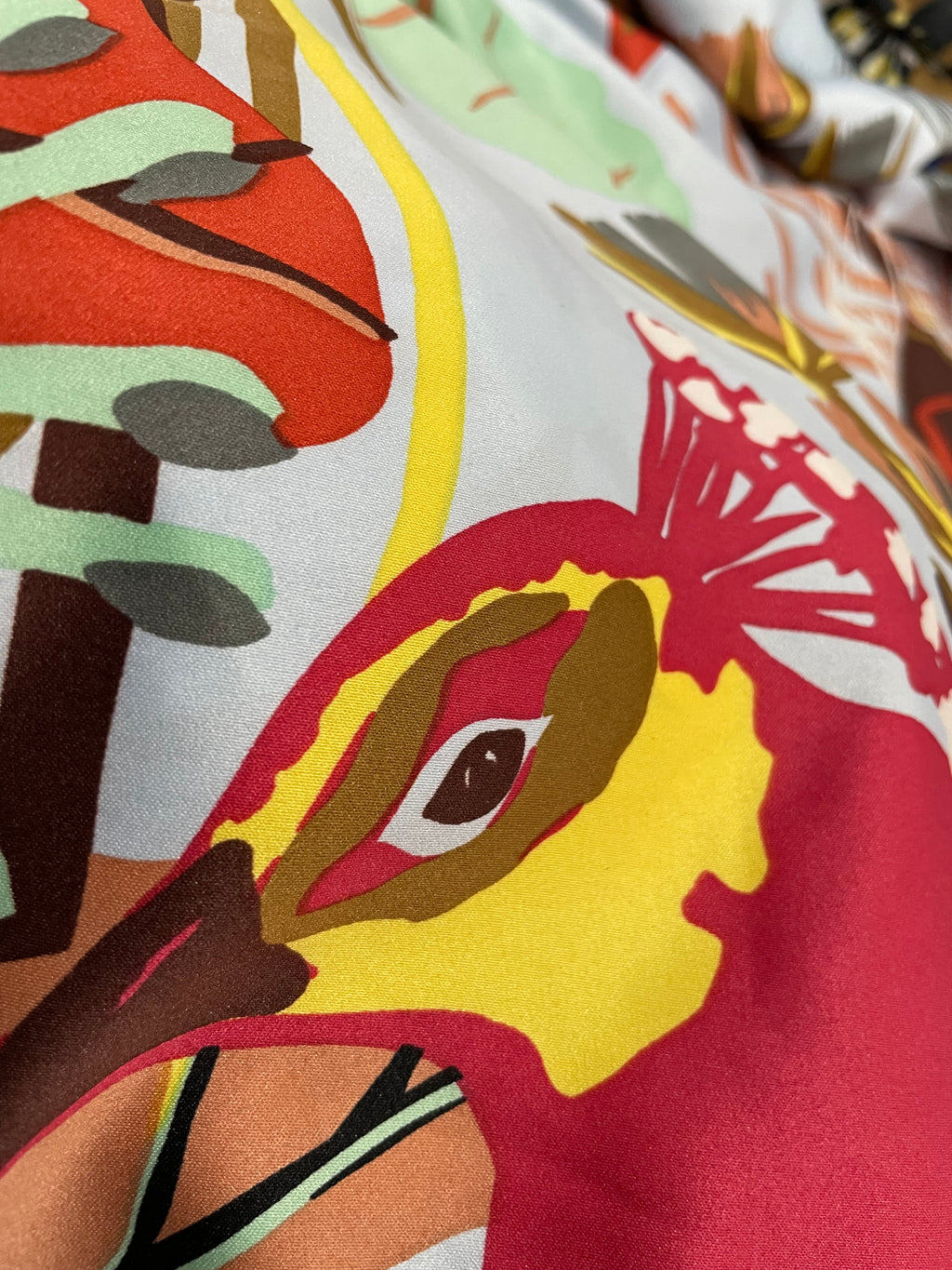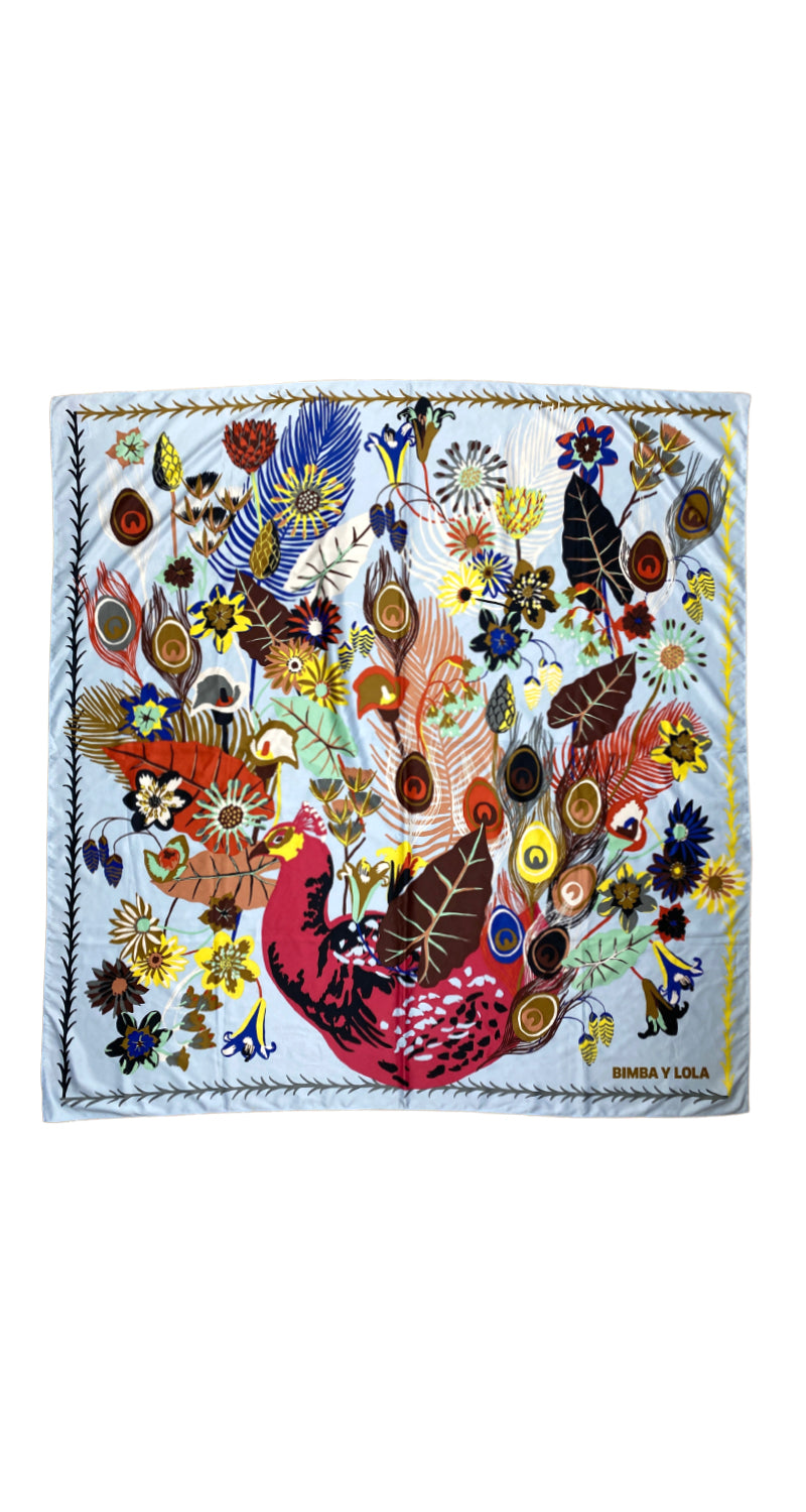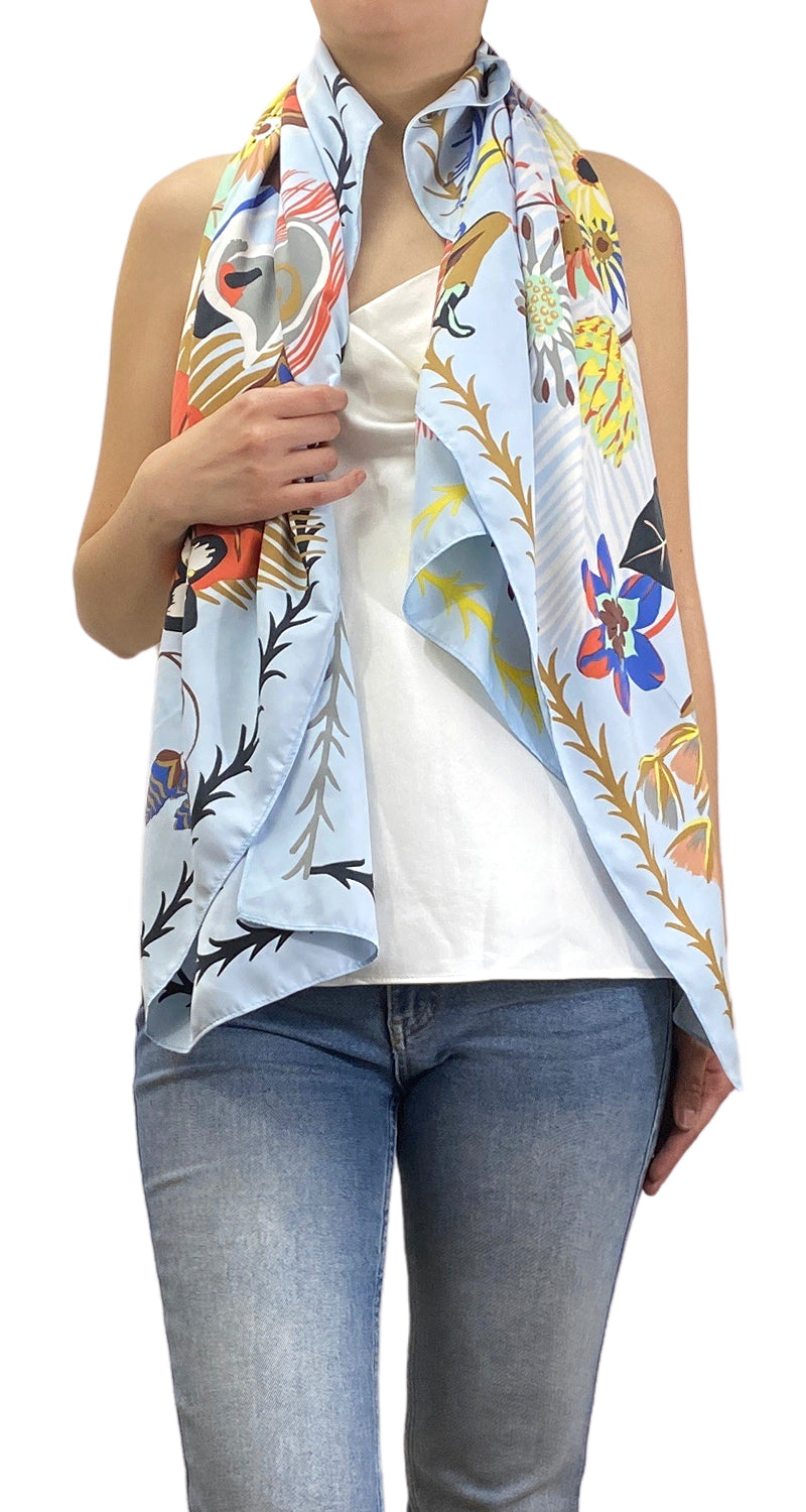 Pañuelo color Celeste satinado con estampado Multicolor. Medidas: 120 x 120 cm