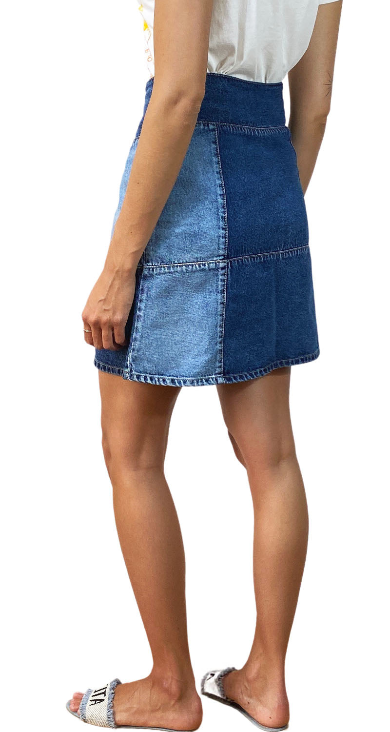 Falda con costuras y bloques de jeans en diferentes tonos. Cierre en trasero.