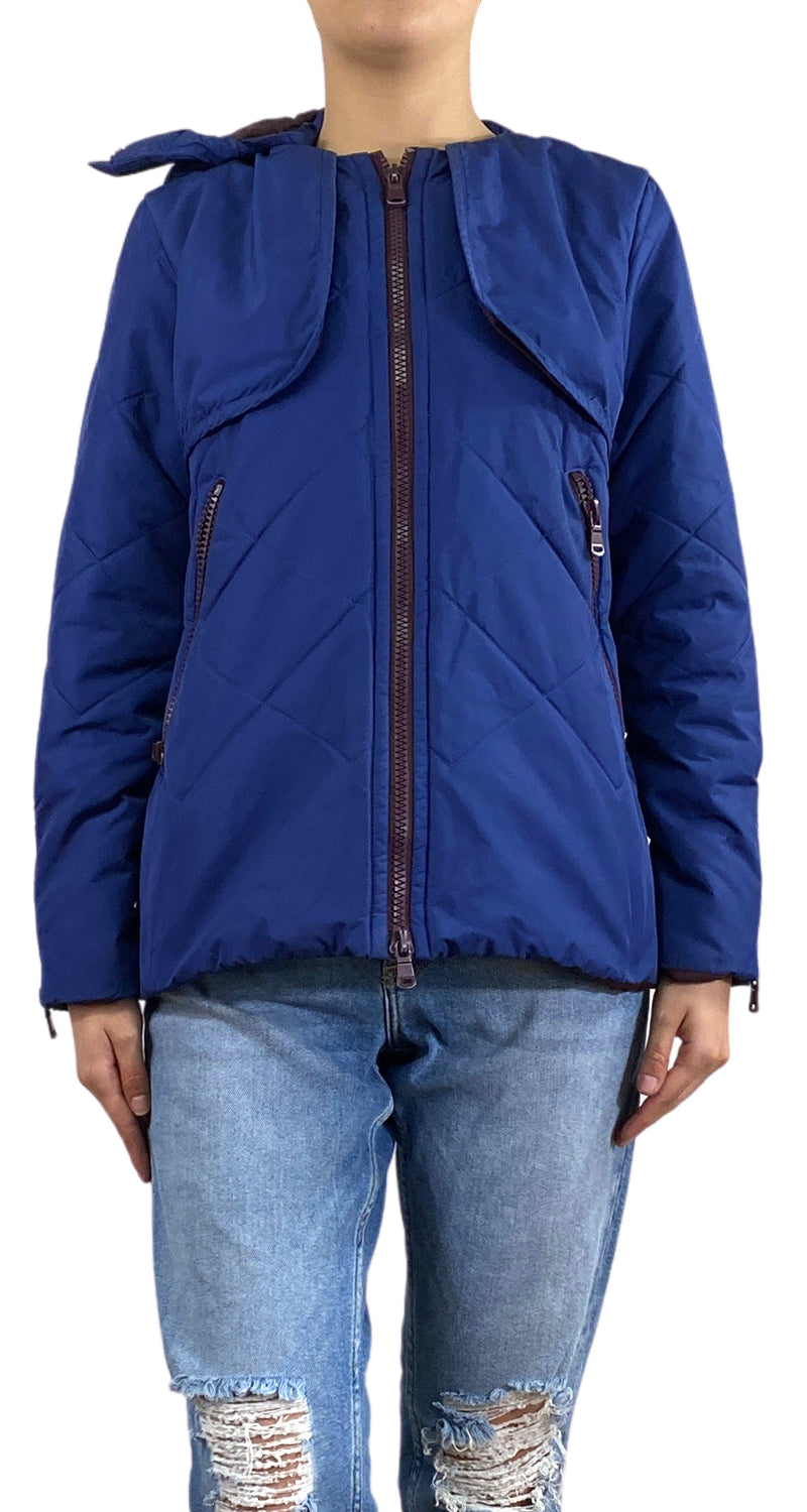 Parca en color Azul con cierre y forro interior en Café, capucha desmontable, presenta mancas que salen con lavado.