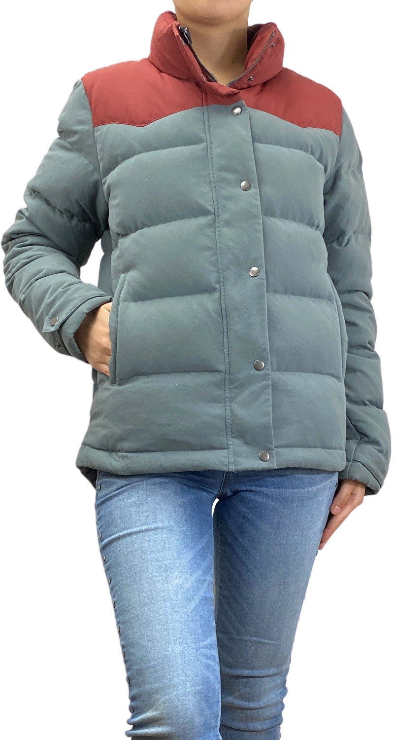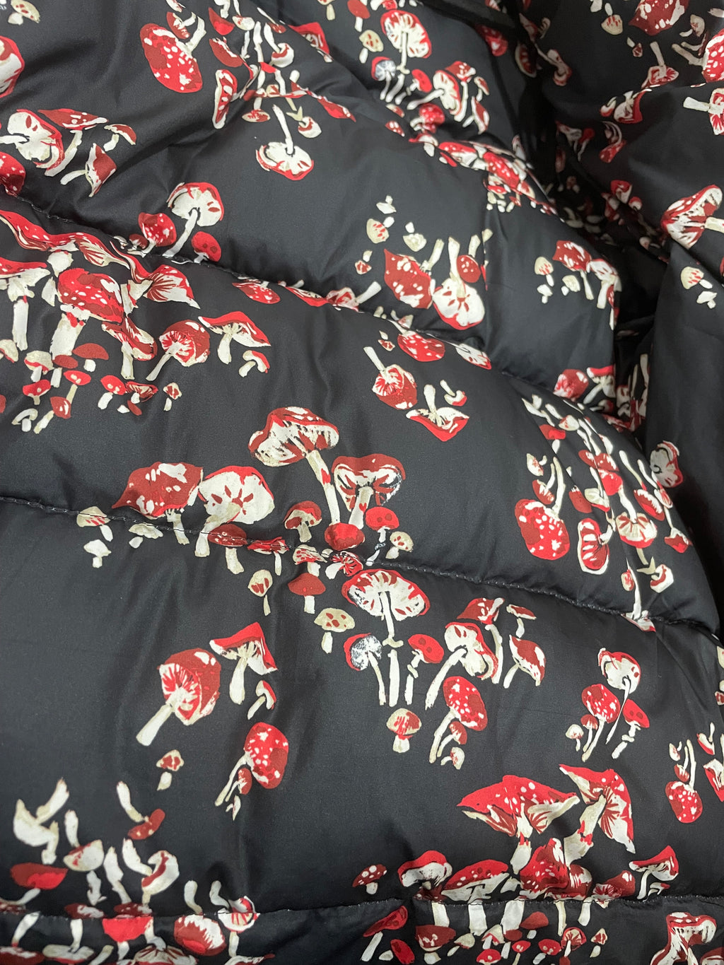 Parca acolchada en color Verde Grisáceo y Terracota, con dos bolsillos, cierre y botones a presión en el frente, forro interior con estampado de hongos.