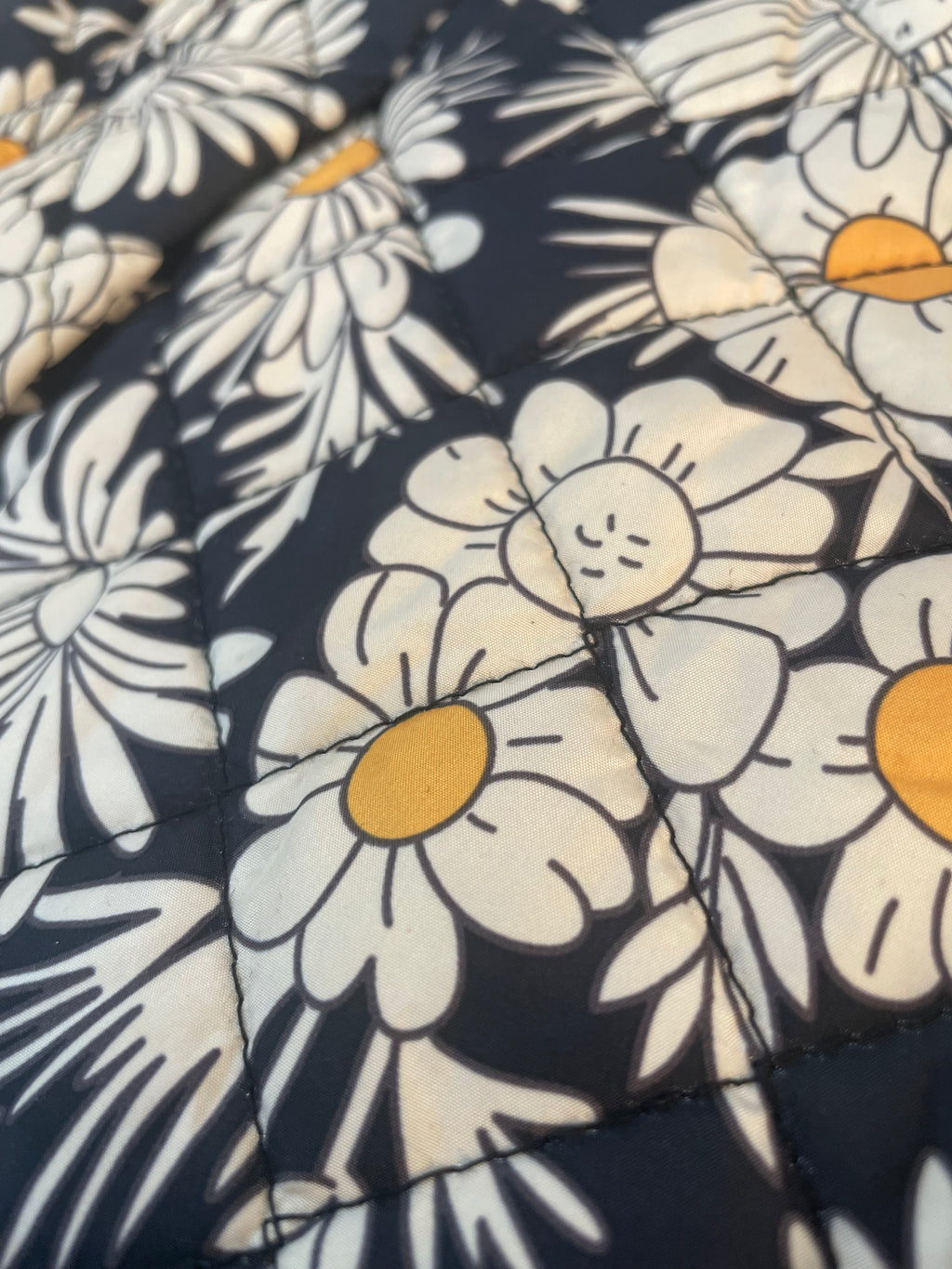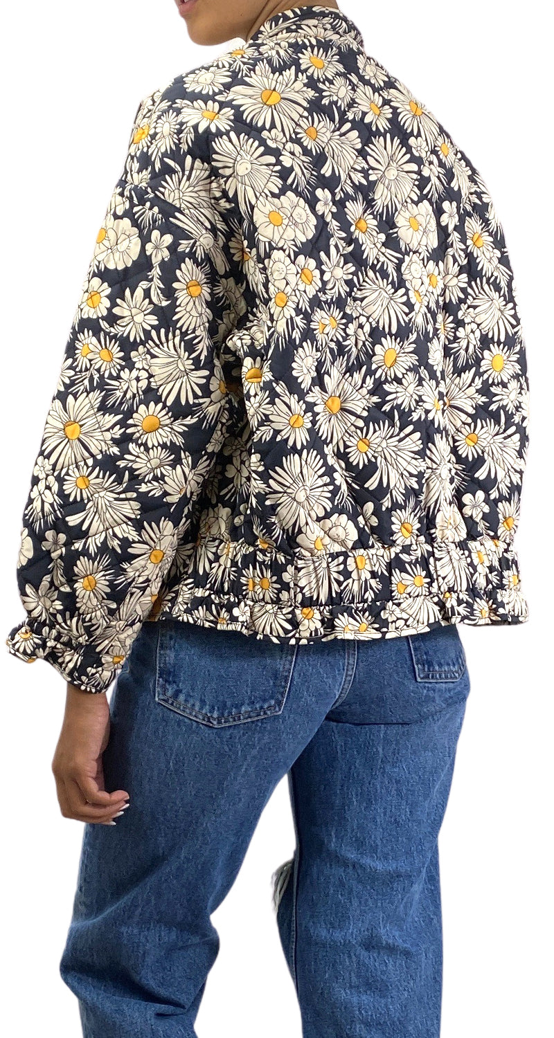 Parca color Azul con estampado de flores Blancas con bolsillos sobrepuestos.