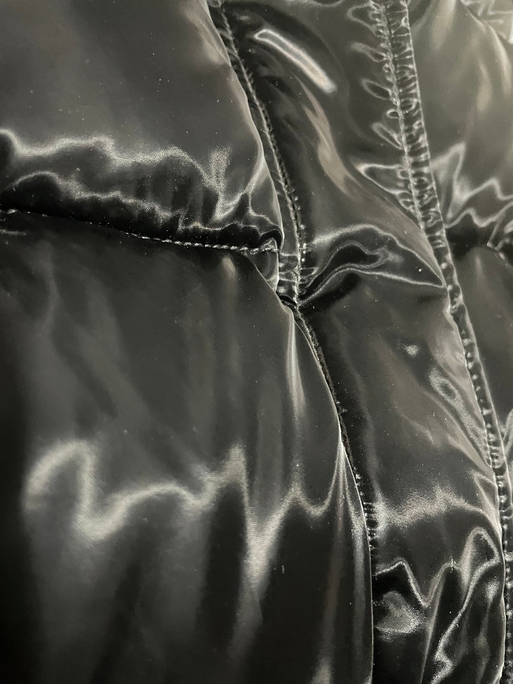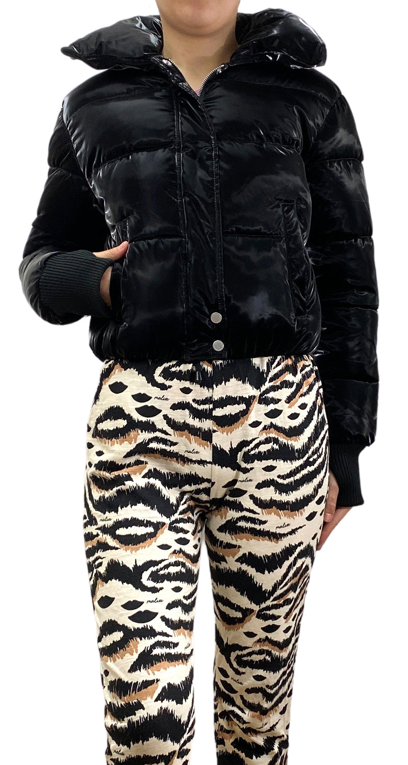 Parca acolchada en color Negro brillante de cuello alto, dos bolsillos, cierre y broches a presión en delantero, puños fruncidos.