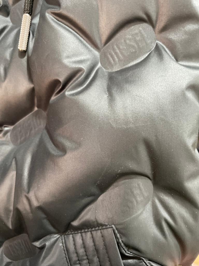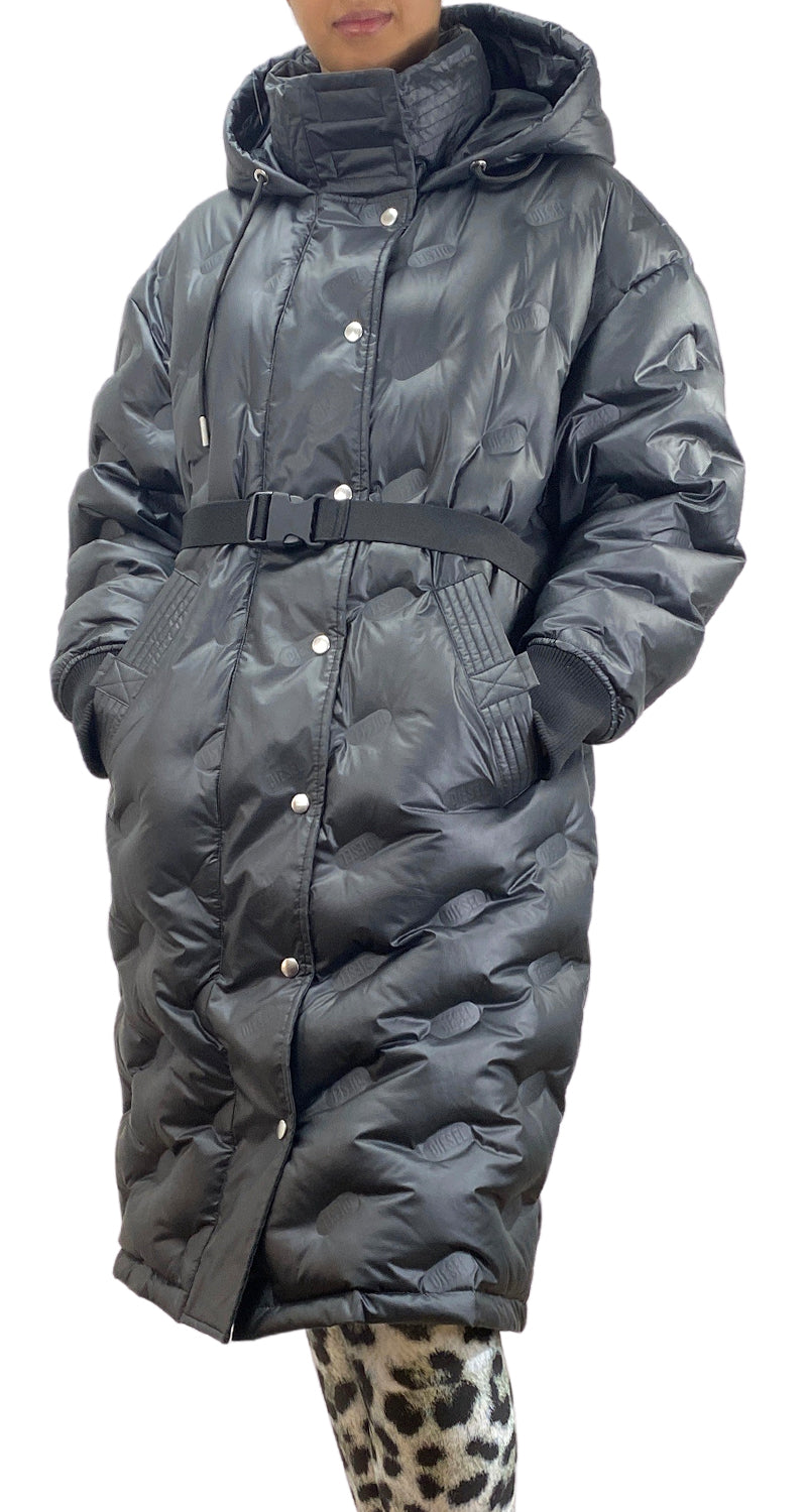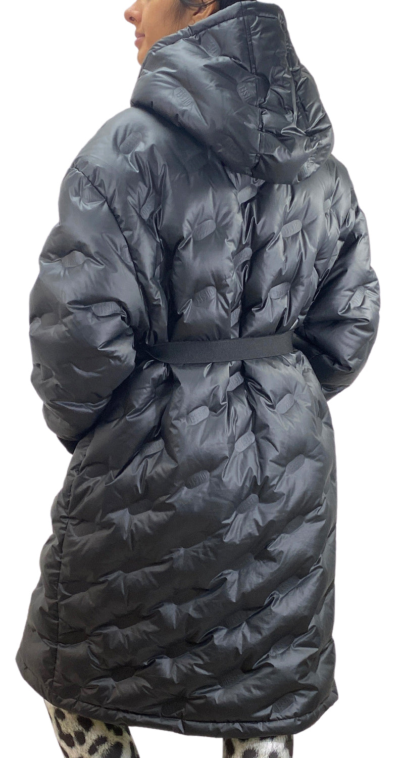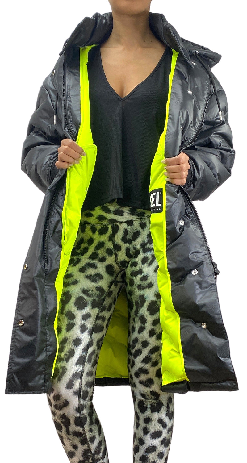 Parca color Negro con forro fluorescente, bolsillos externos, capucha y detalle de letras propias de la marca en relieve. Altura modelo 1.76.