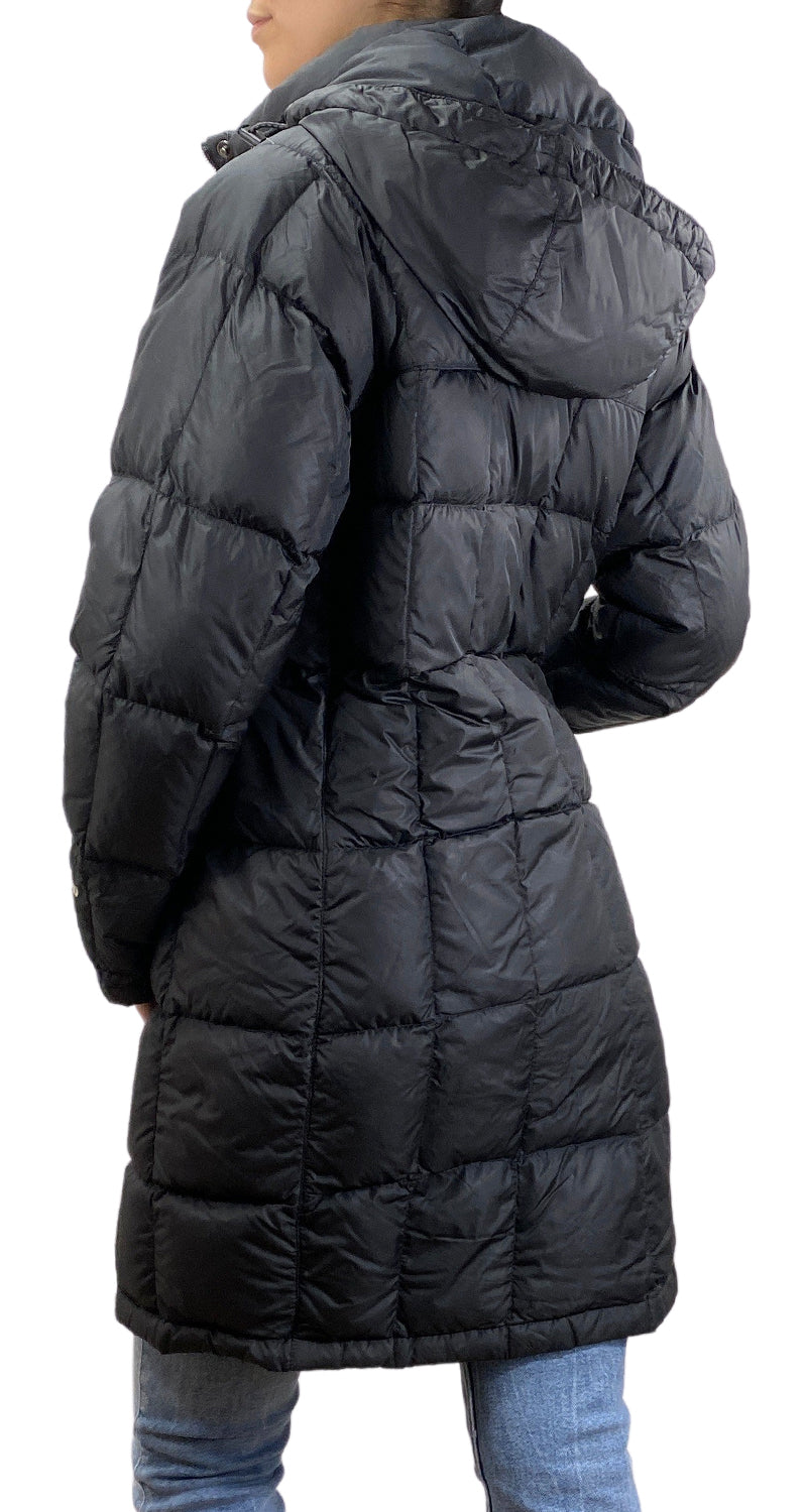 Parca color Negro de Nylón con bordado frontal de la marca y capucha. Presenta signos de uso en puños.