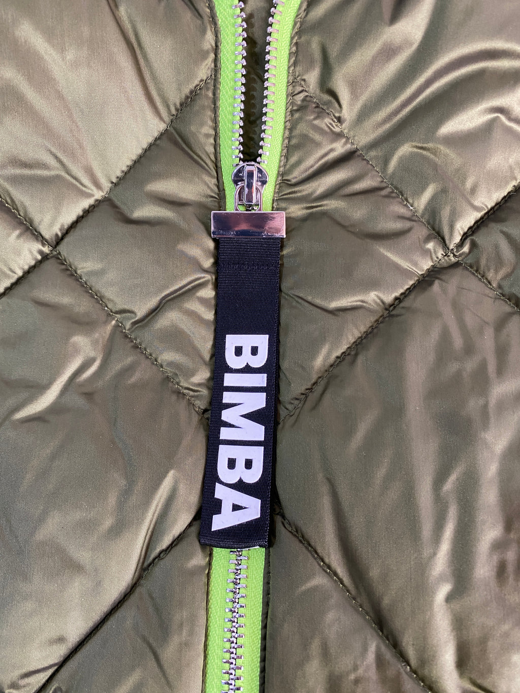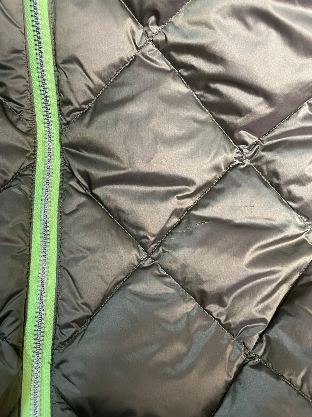 Parca color Verde con capucha, bolsillos frontales y tirador con estampado de letras propias de la marca. Presenta leve detalle en delantero.