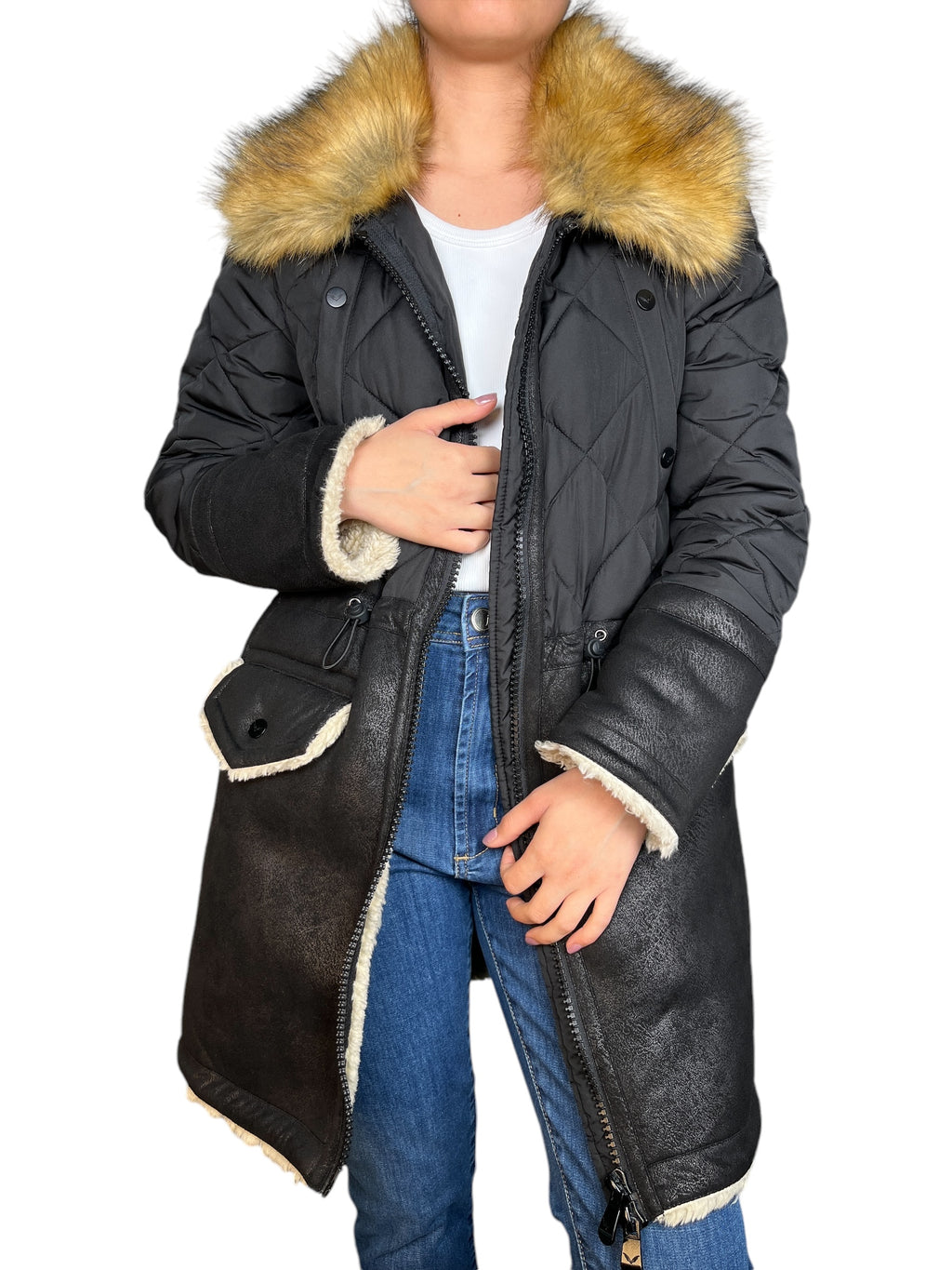 Piel de cuello sintética desmontable. Altura de modelo 1,60