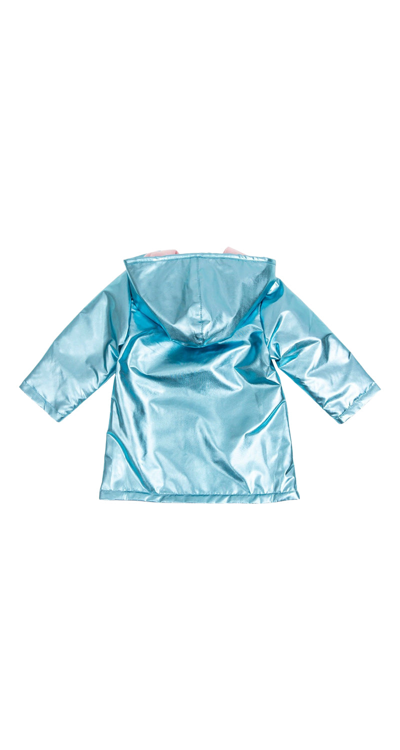 Parka azul metalizada con bolsillos en delantero con forma de corazón. Interior Rosado de polar.
