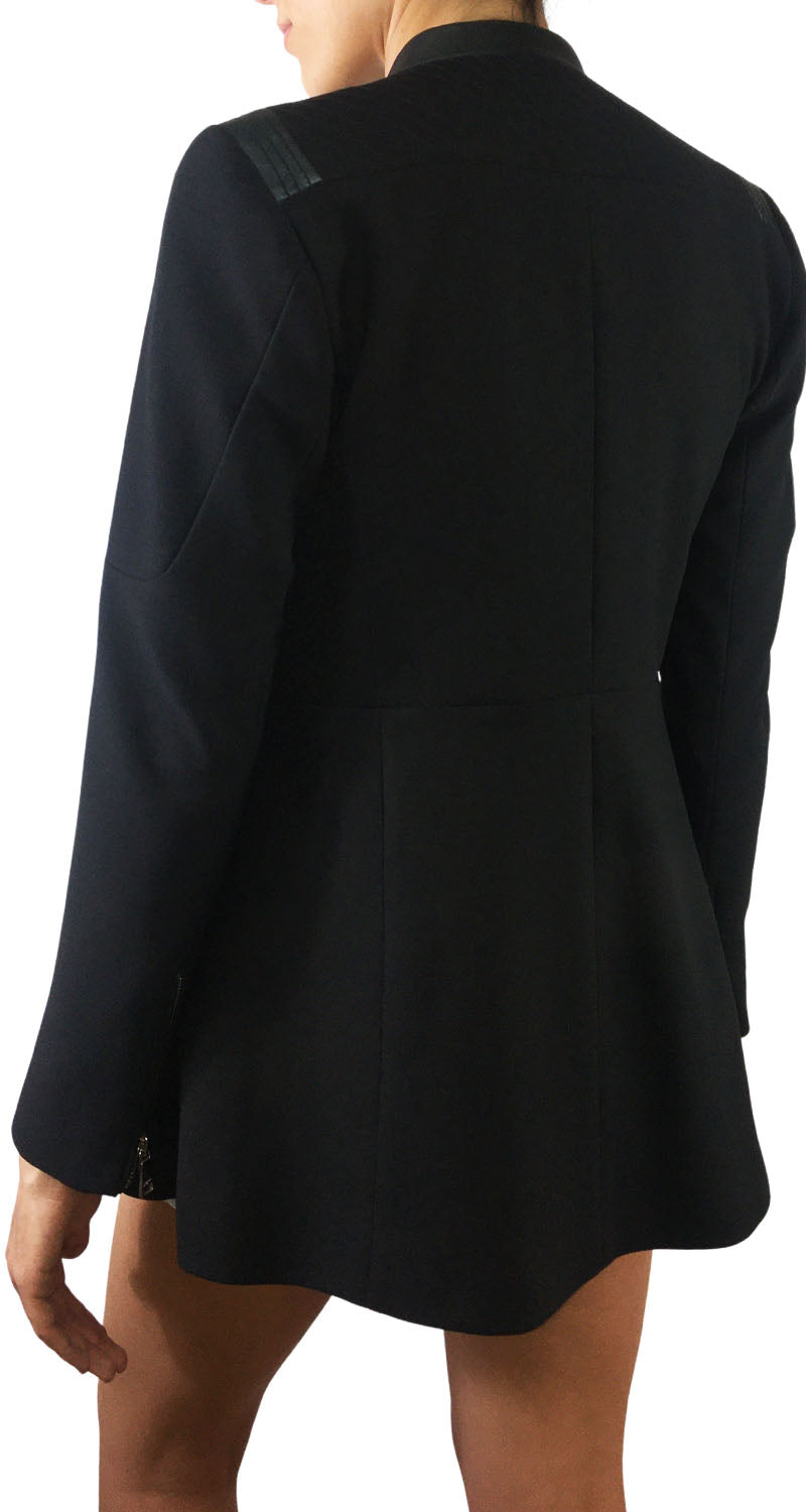 Chaqueta con cierre, 3 bolsillos color Negro y detalles de cuero, tiene vuelo en ruedo. Talla 40/1 de la marca.