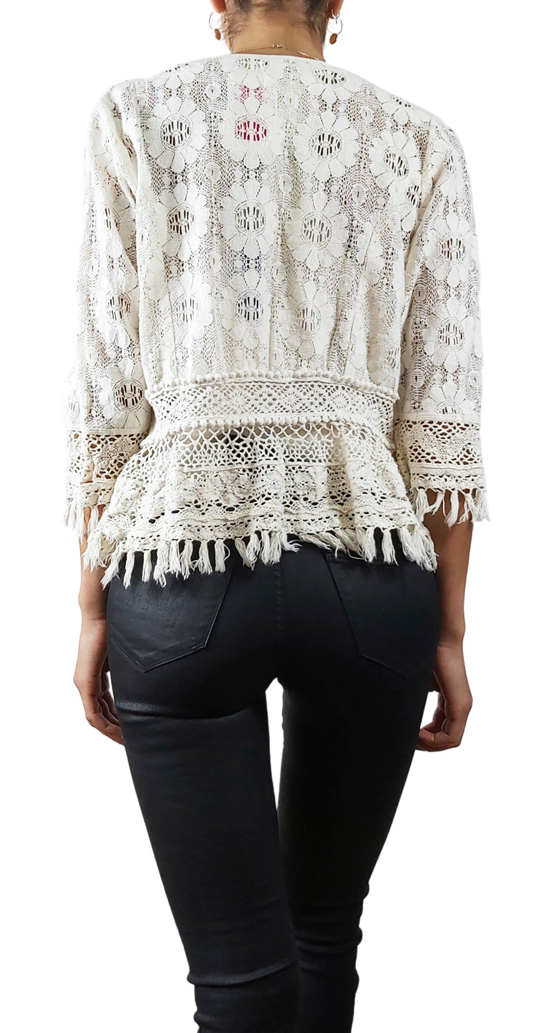 Chaqueta con diseño de macramé y bordado en tonos Multicolor, con botones en delantero.