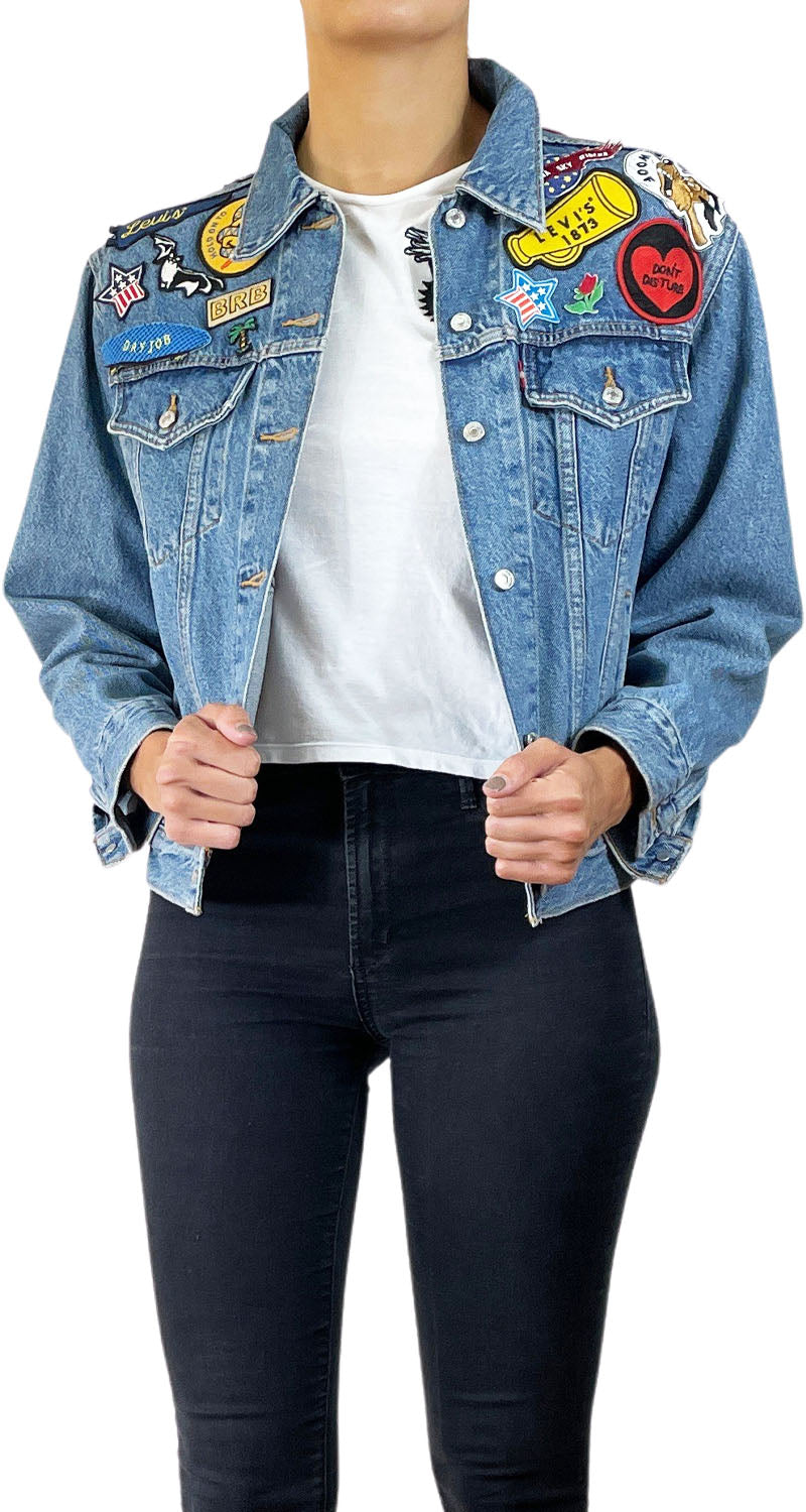 Chaqueta de Jeans Azul, con diseño de parches Multicolor.