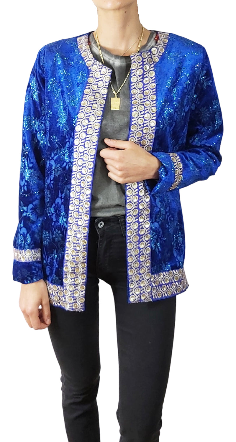 Chaqueta Azul con textura velvet, diseño de flores con brillos y lentejuelas doradas.