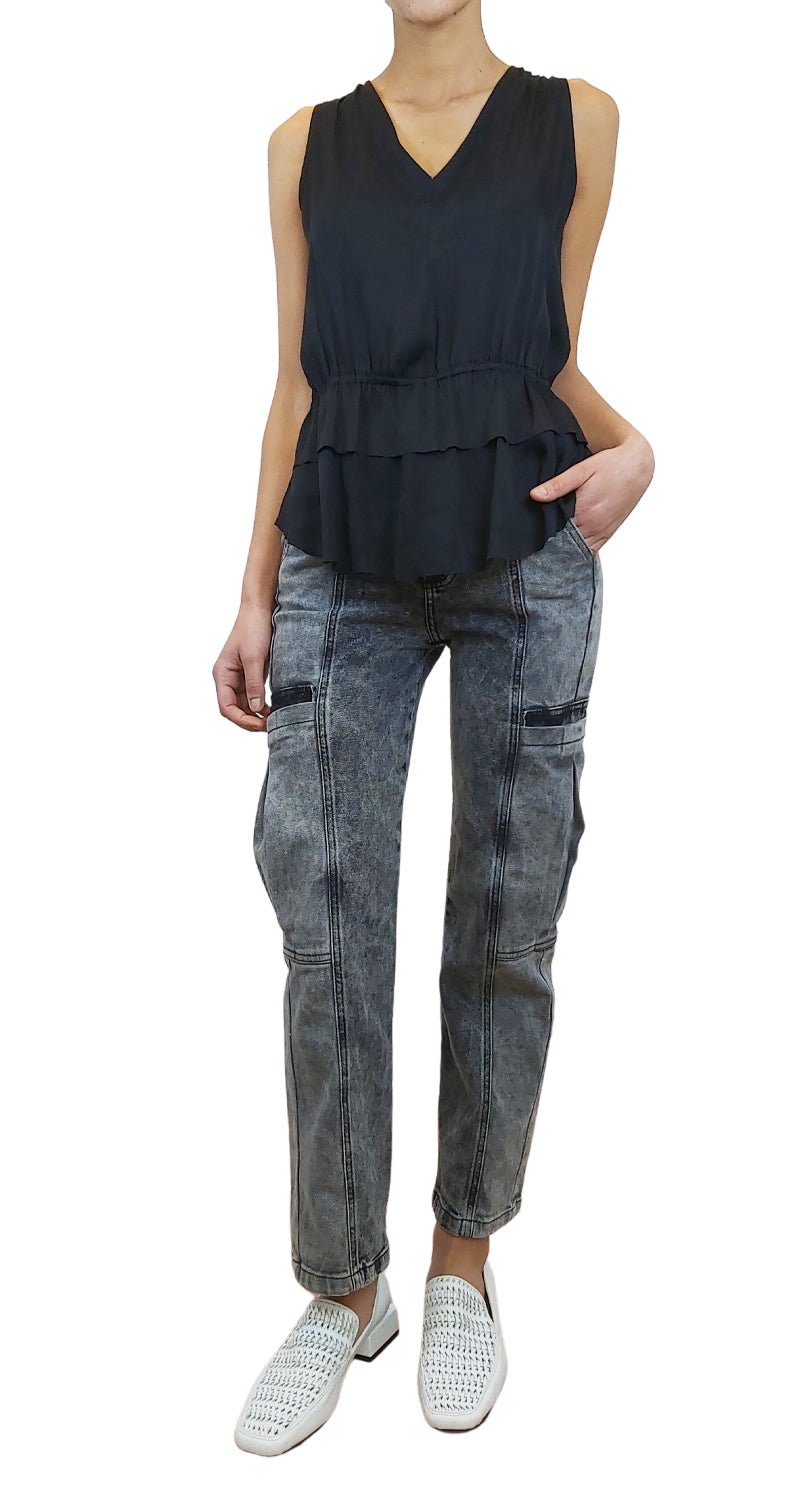 Blusa sin mangas color Negro satinada con cintura ajustable. Leves signos de uso.