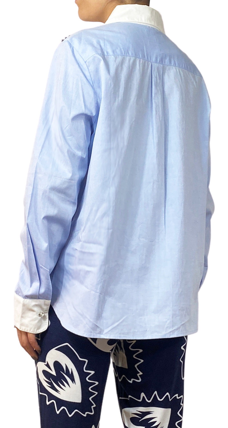 Blusa Color Azul con diseño de brillos en hombros, cuello y puños color Blanco. Talla 1 de la marca.