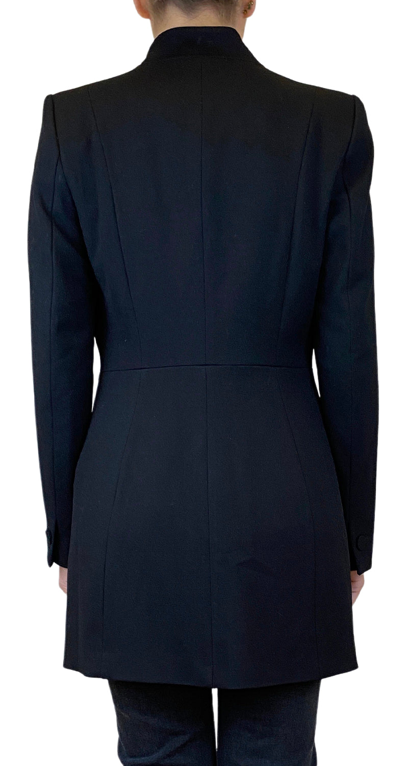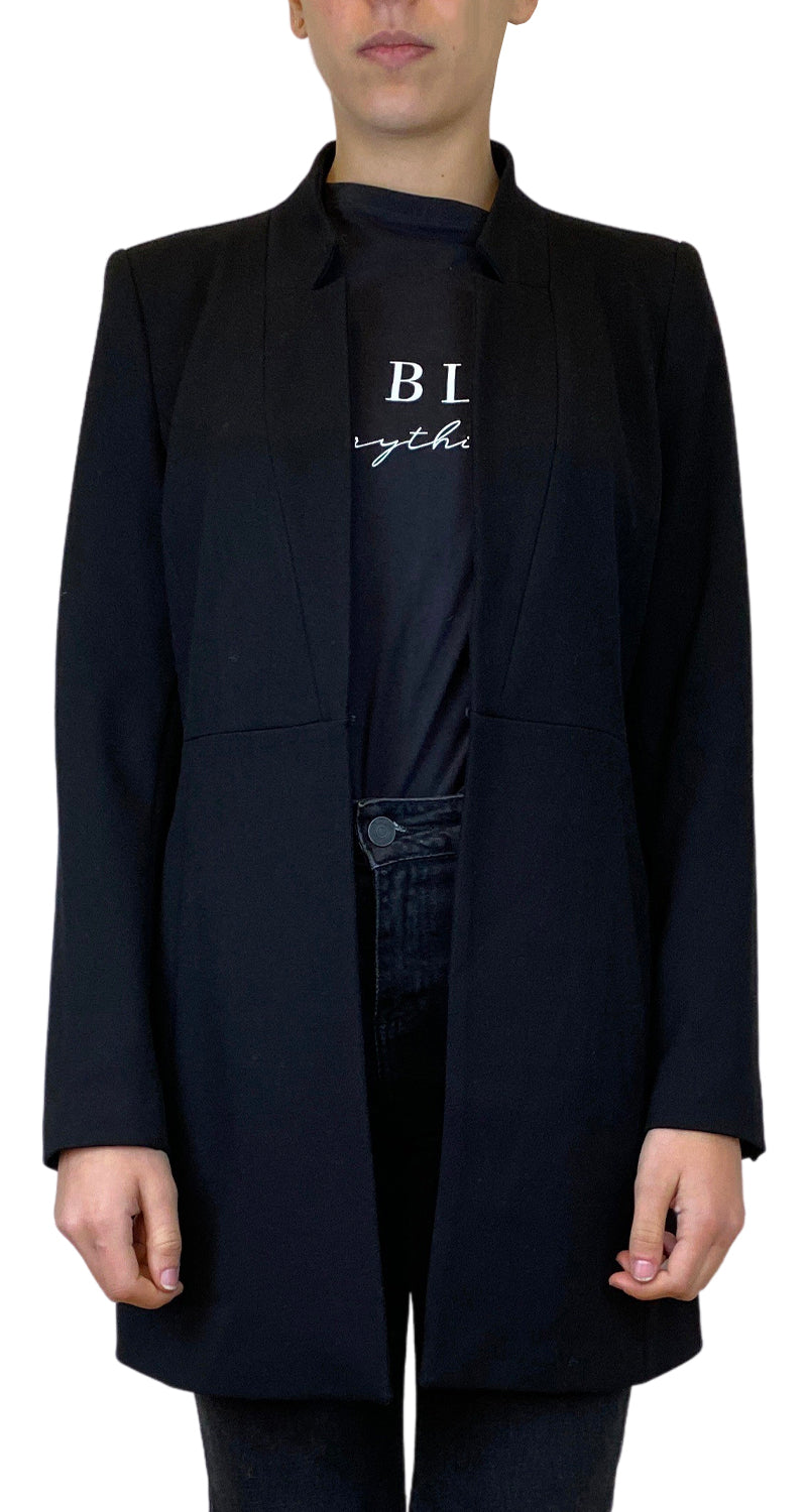 Abrigo color Negro con cuello invertido, corte en cintura y bolsillso en costado.
