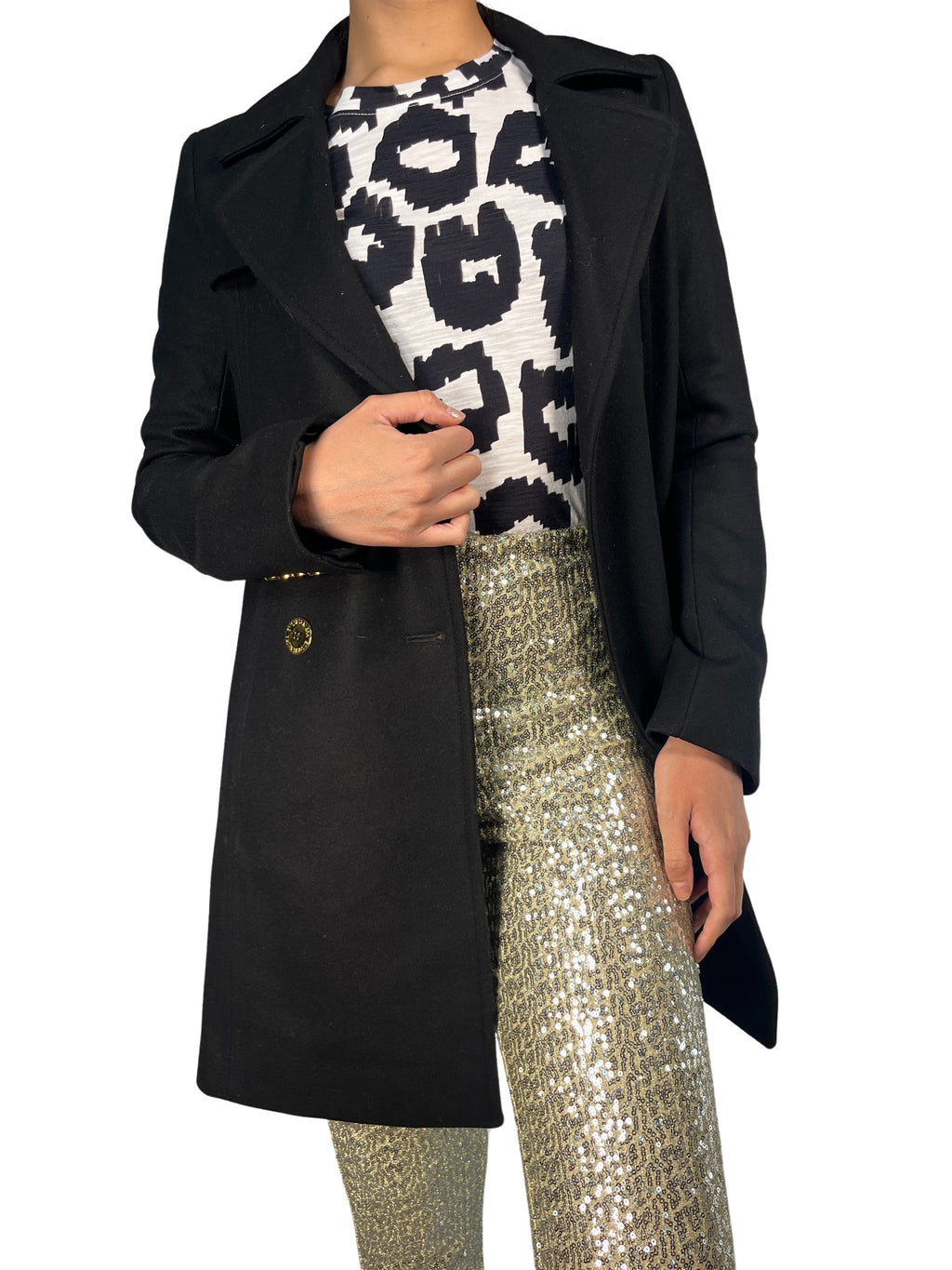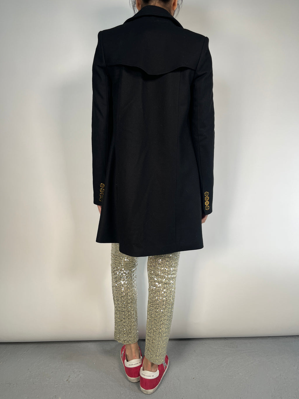 Abrigo de Lana color Negro con doble botonadura, botones metálicos Dorados y bolsillos tipo ojal en costado. Leve mancha en delantero, desaparece con lavado.