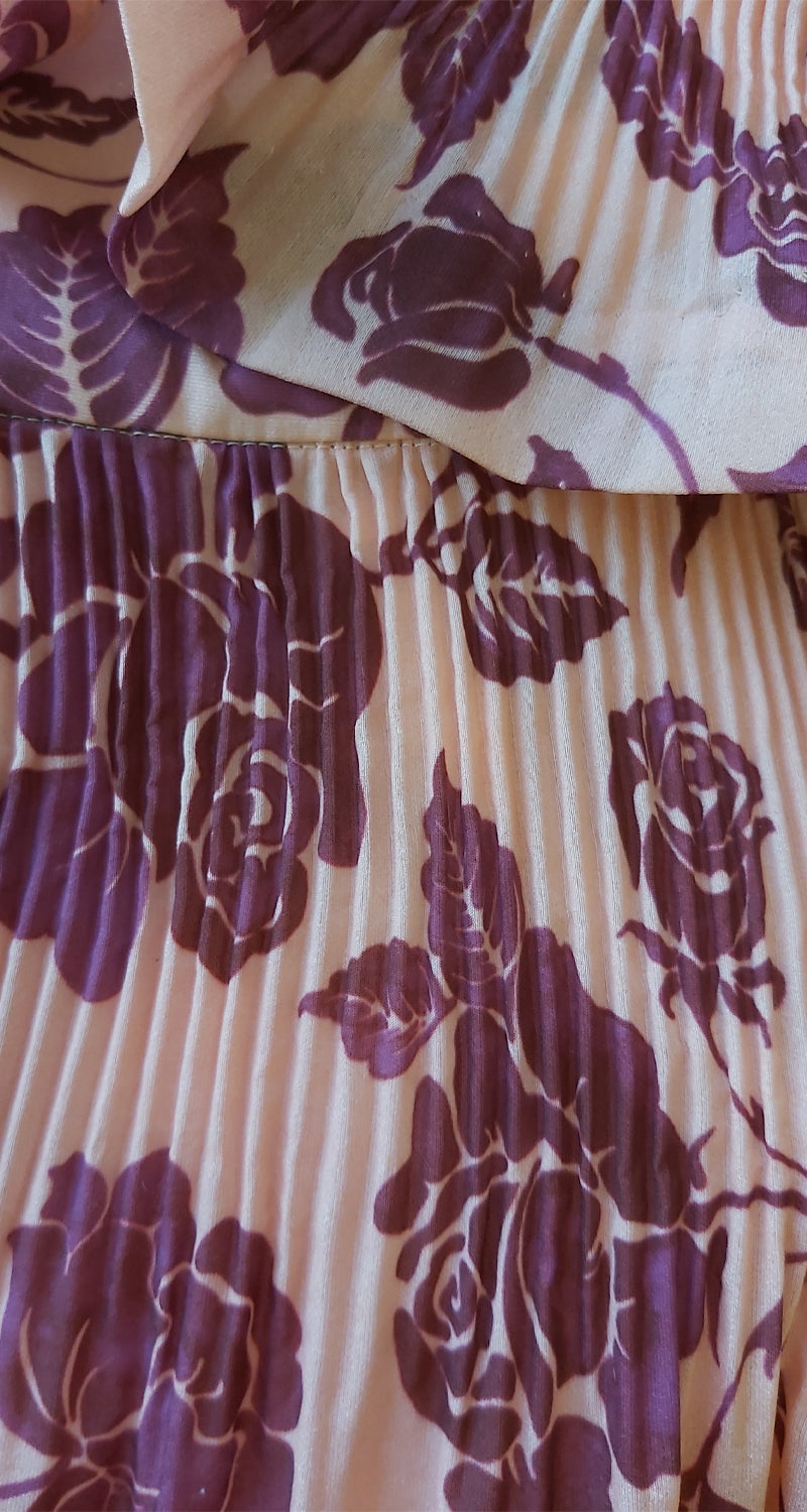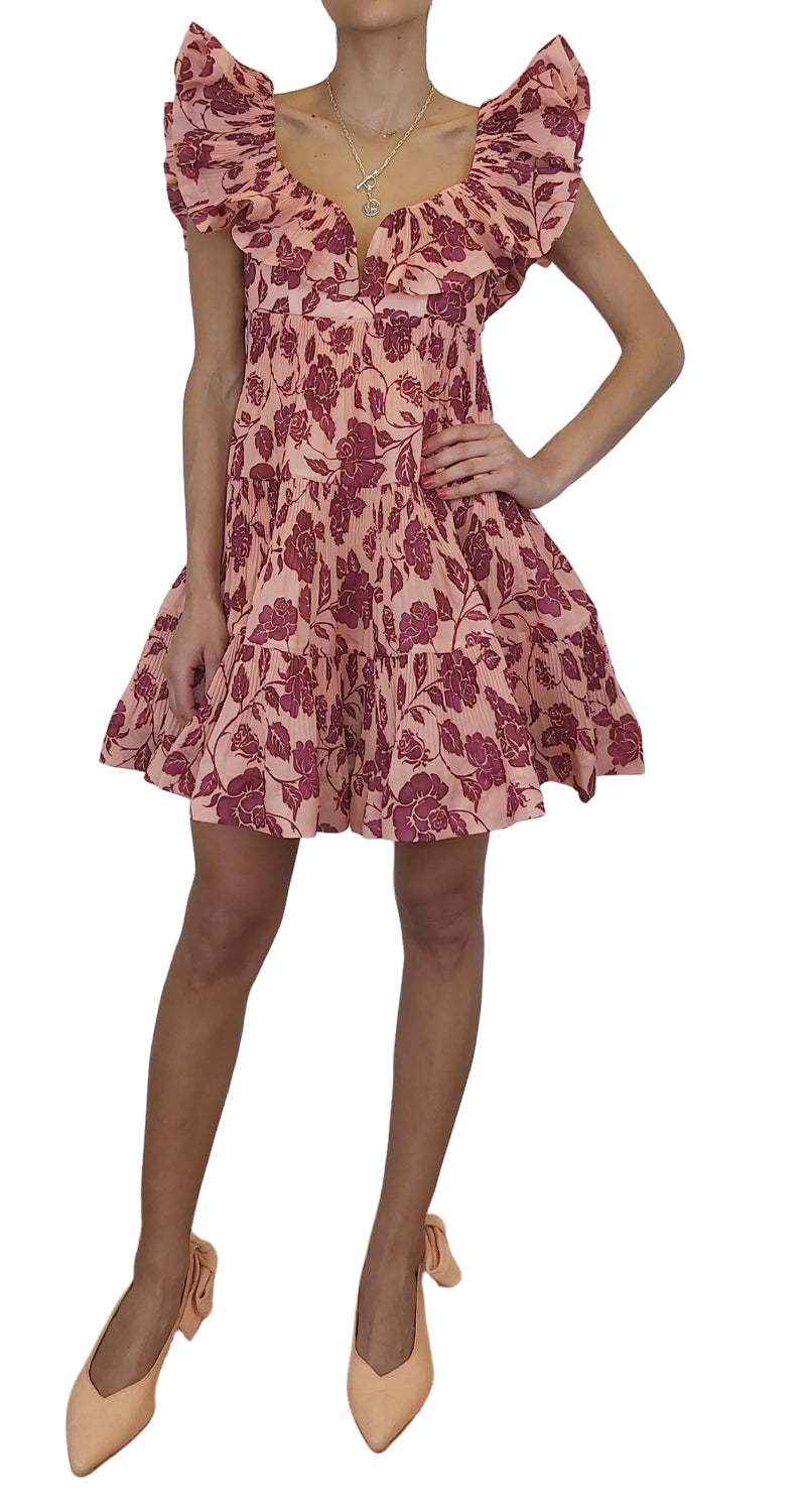 Vestido mini con tela plisada y vuelos sobresalientes. Color Coral con diseño de rosas en Burdeo.