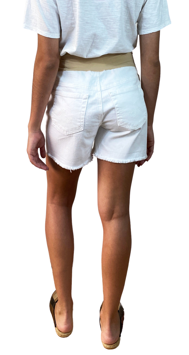 Shorts Blancos maternales con bolsillos falsos y ruedo desflecado.