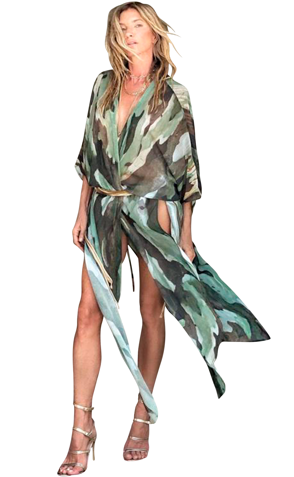 Kimono salida de baño de camuflaje pintado a mano, abierto con mangas 3/4