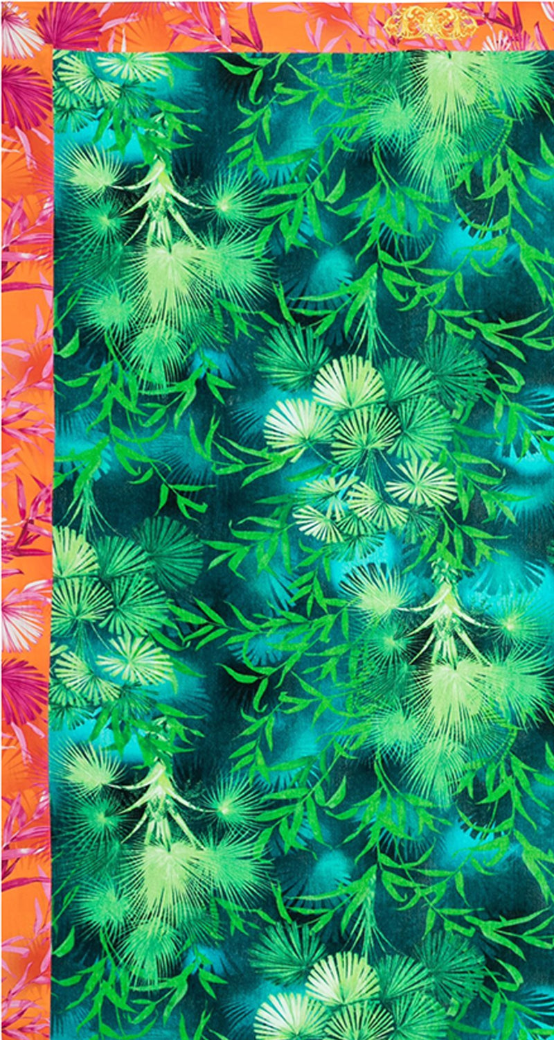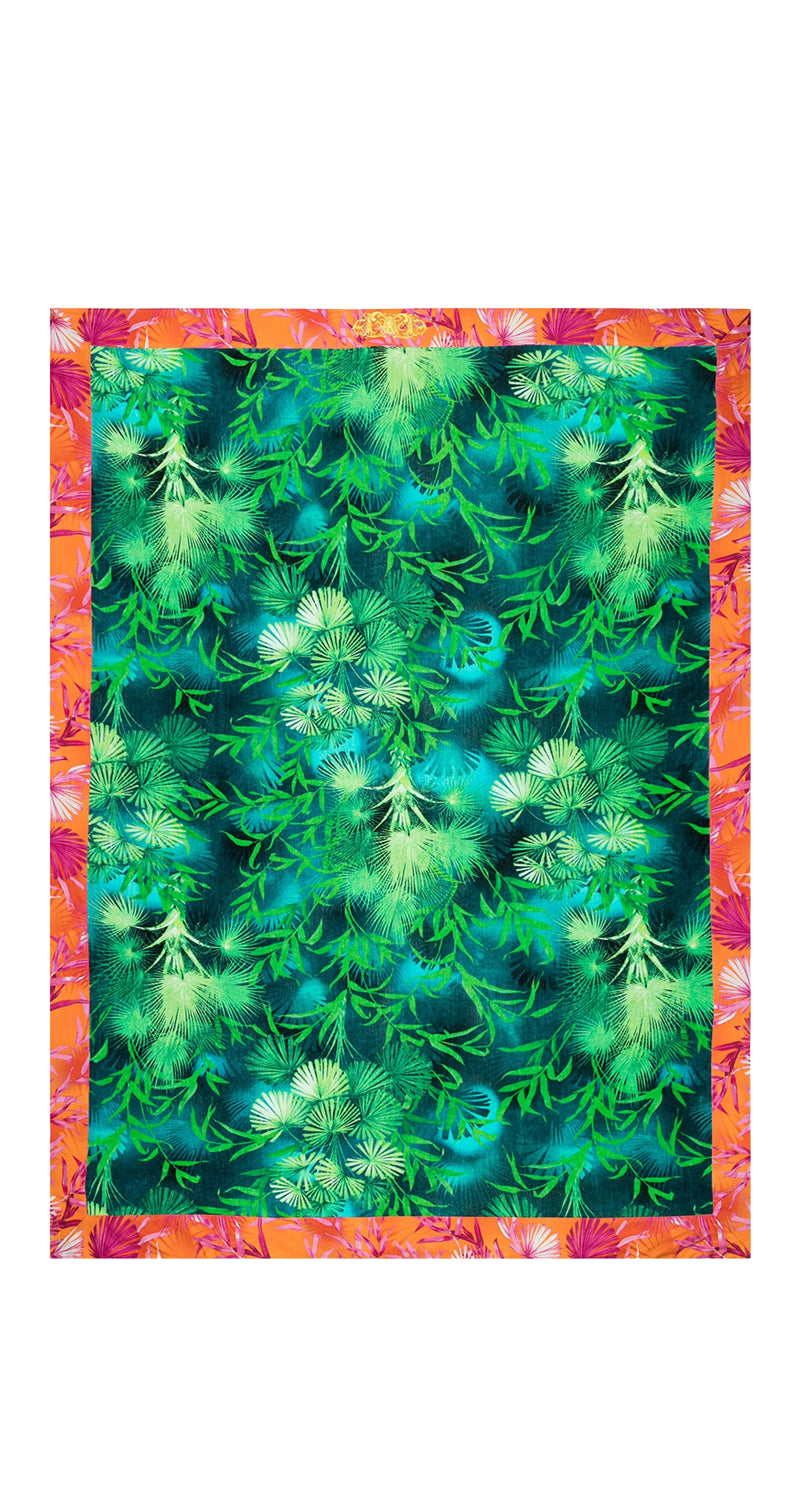 Toalla color Verde con diseño estampado de hojas y ruedo en color Naranjo. Medidas: 200 cm de Largo x 145 cm de Ancho. Codigo de verificación: 04ECBF52FA6780