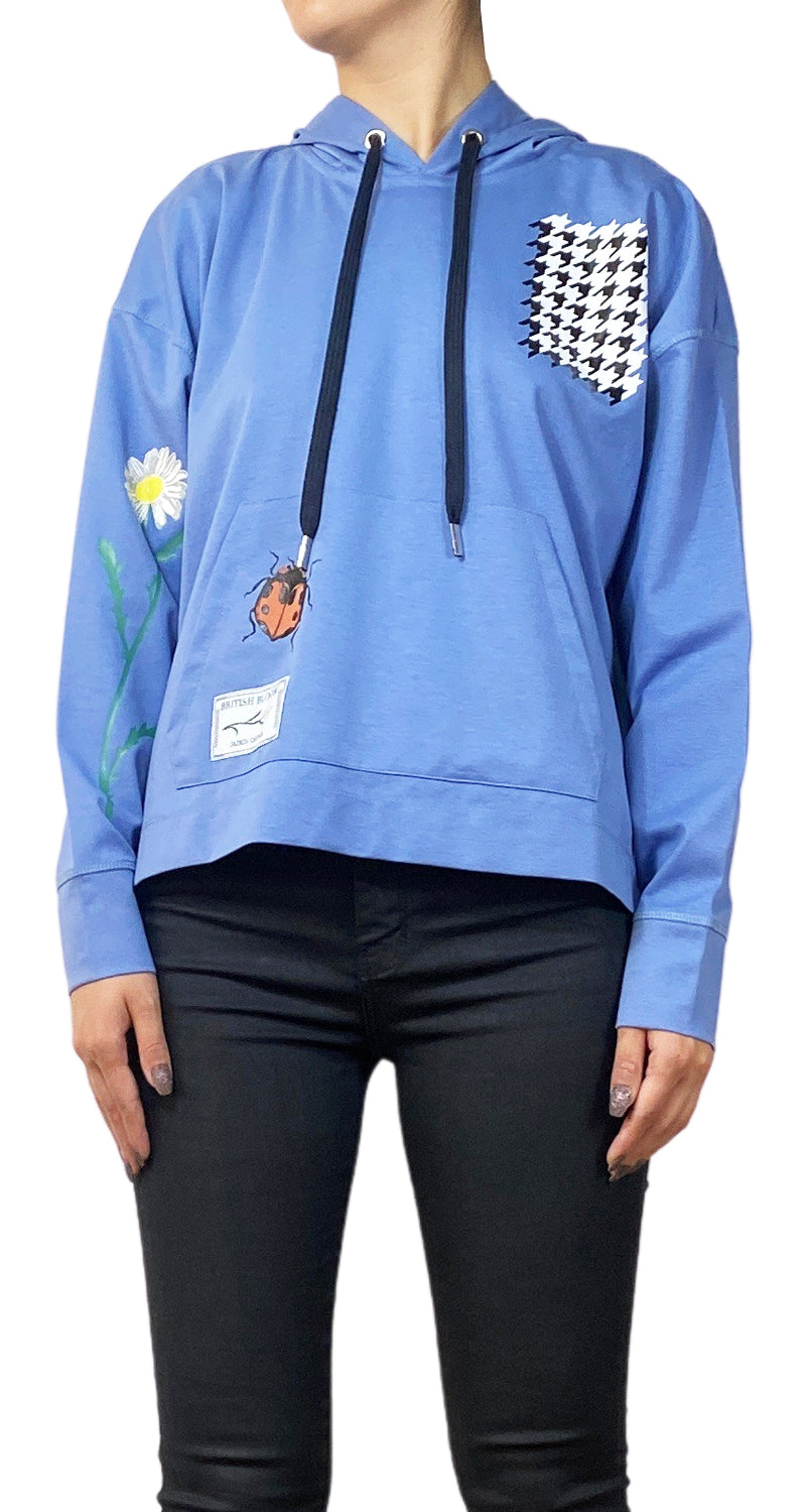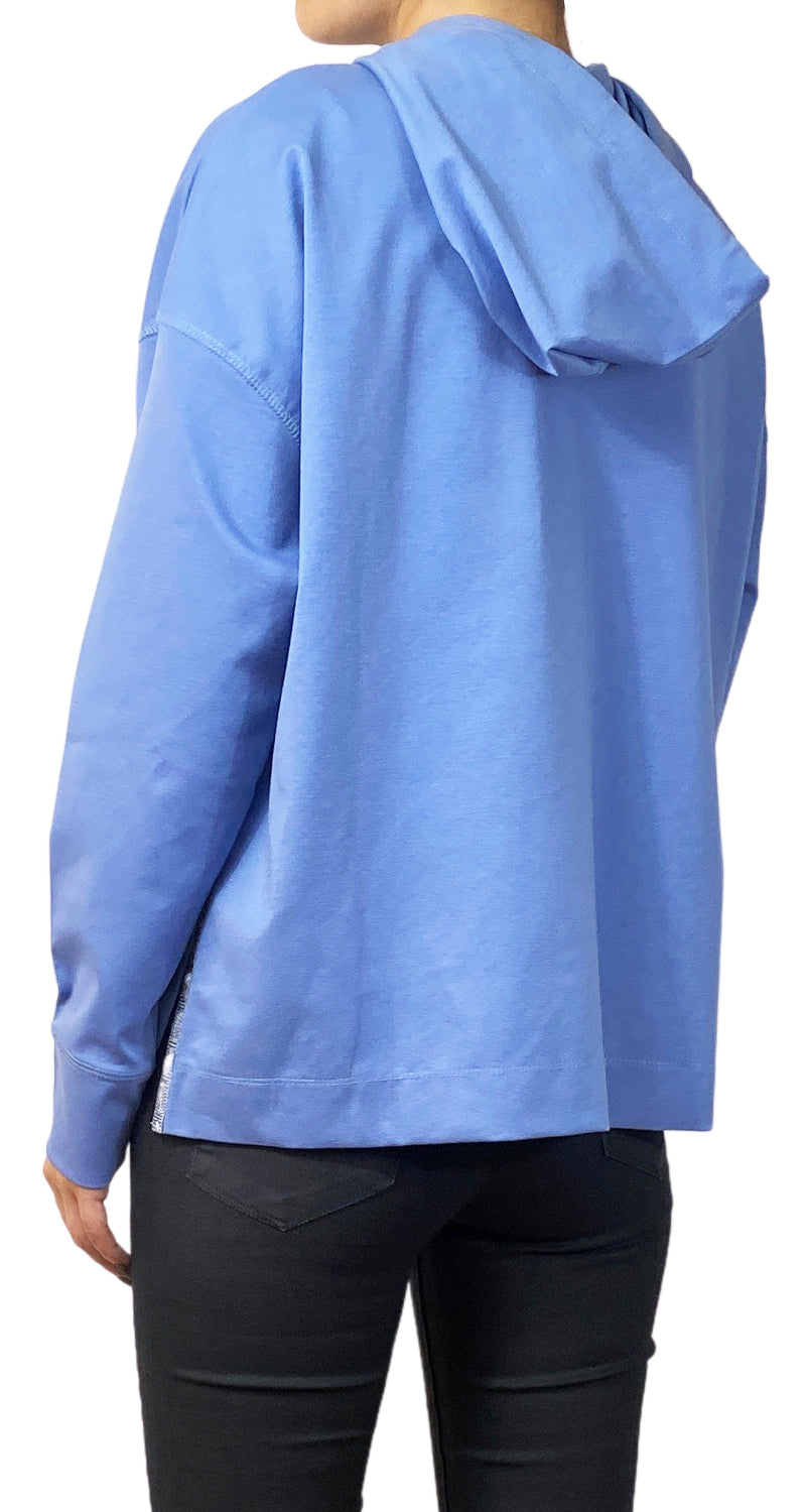 Polerón color Azul con estampado, bolsillos y capucha con cordones. Talla 1 de la marca.