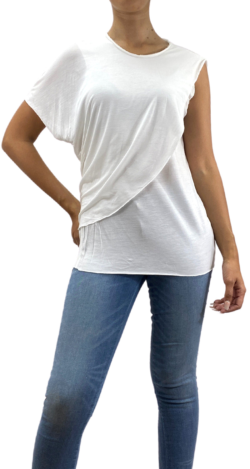Polera Blanca con diseño asimétrico, lado derecho con manga corta, izquierdo sin manga.