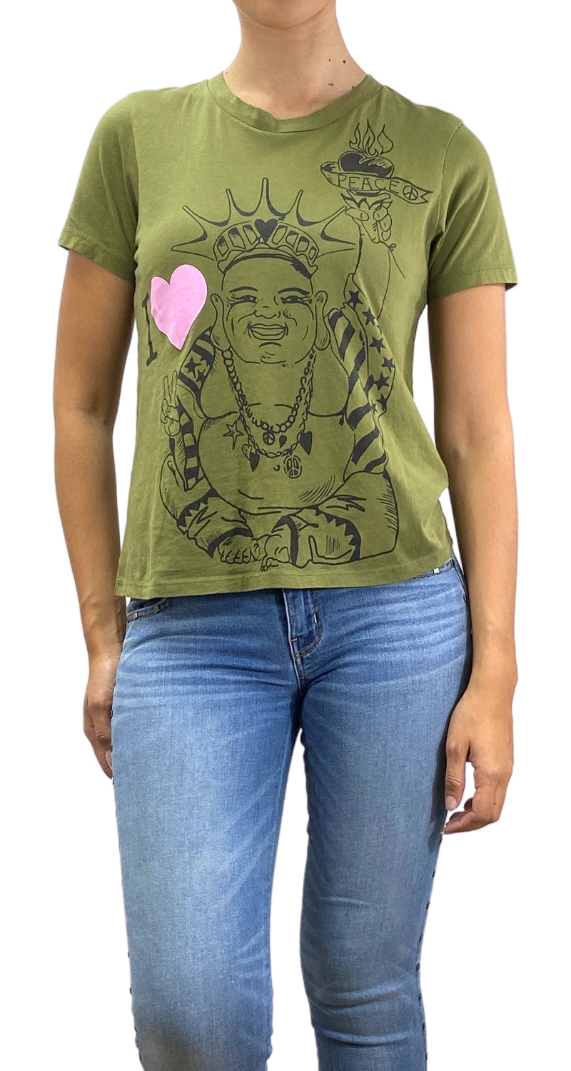 Polera color Verde con estampado de Buda y corazón Rosado. Talla 1 de la marca.