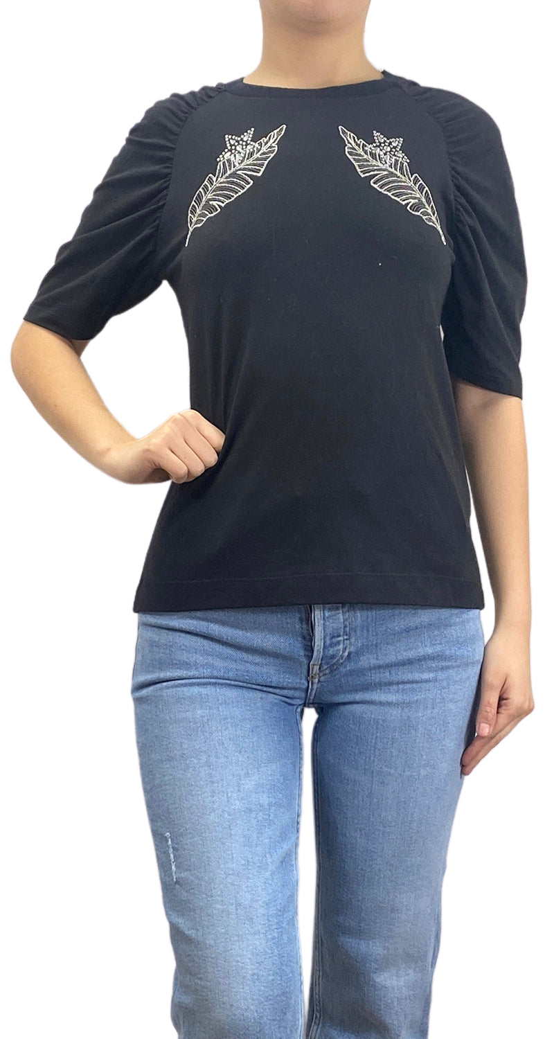 Polera color Negro con plises en hombros y estampado bordado con hilos metalizados, aplicaciones brillantes en forma de estrella. Talla 2 de la marca.