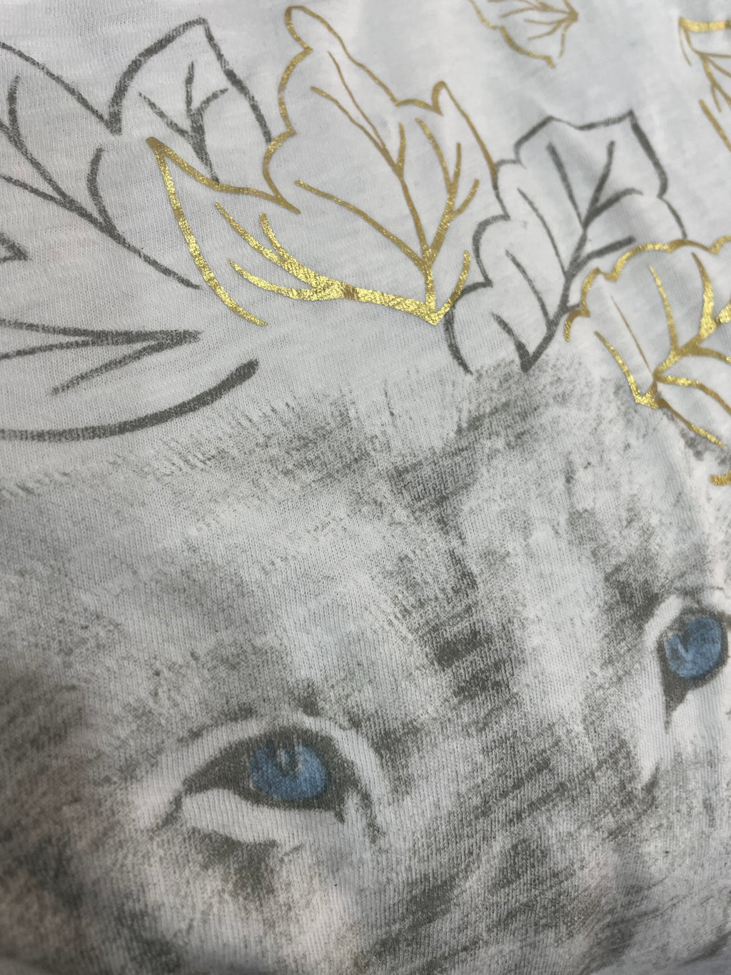 Polera din mangas color Blanco con estampado en Gris y Dorado.