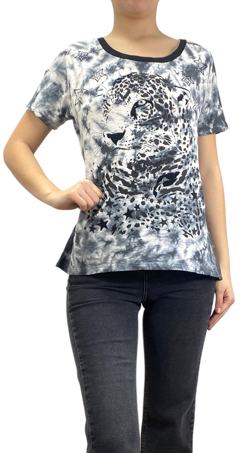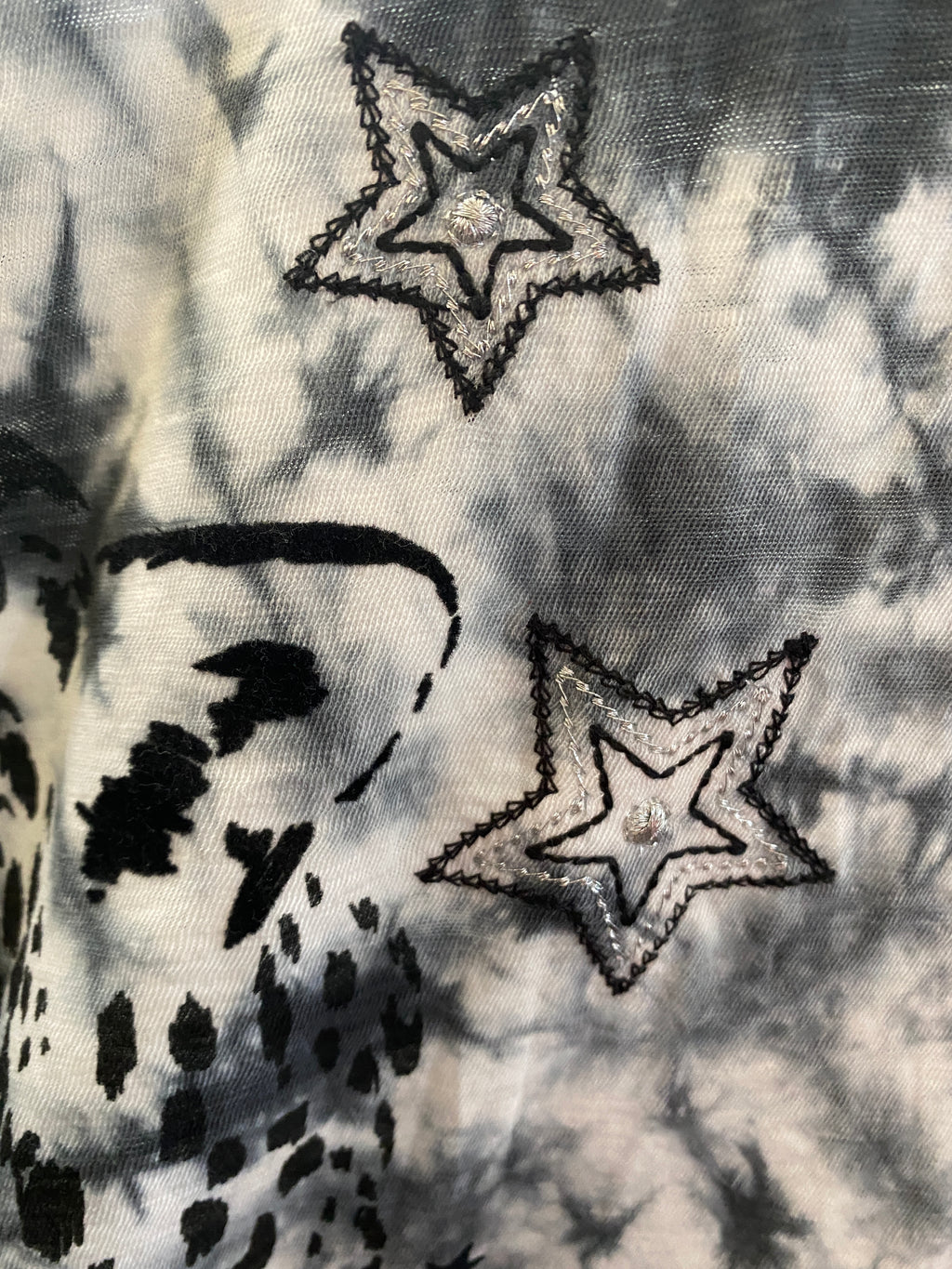 Polera color Gris estilo tie dye, con estampado frontal, detalles en relieve y bordado de estrellas.
