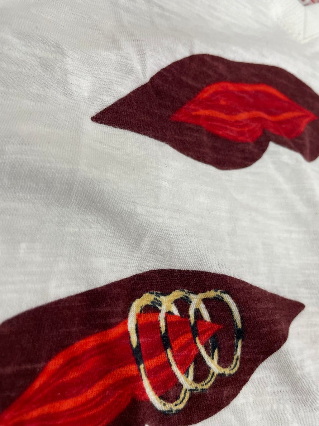 Polera color Blanco con estampado de labios, cuello V. Talla 1 de la marca.
