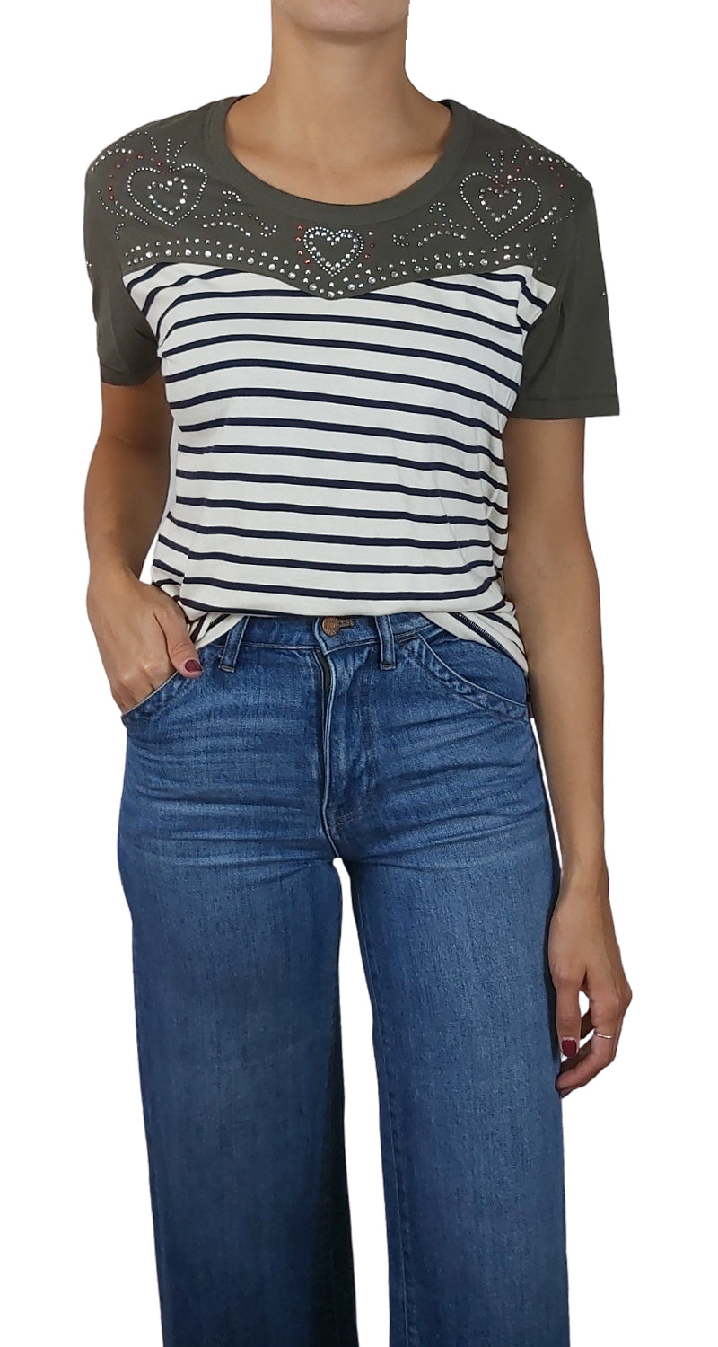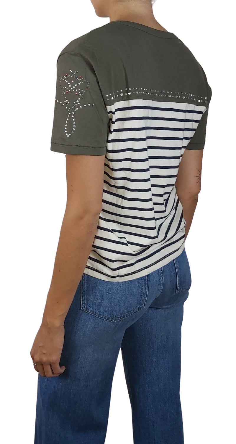 Polera color verde con diseño a rayas Beige con Azul y detalles de tachas en delantero.