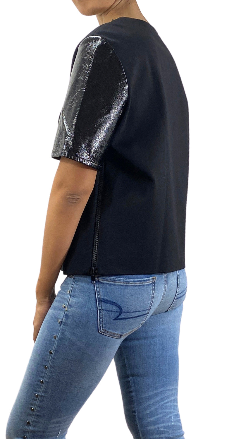 Polera en color Negro con mangas de Ecocuero, cierre en lateral izquierdo.