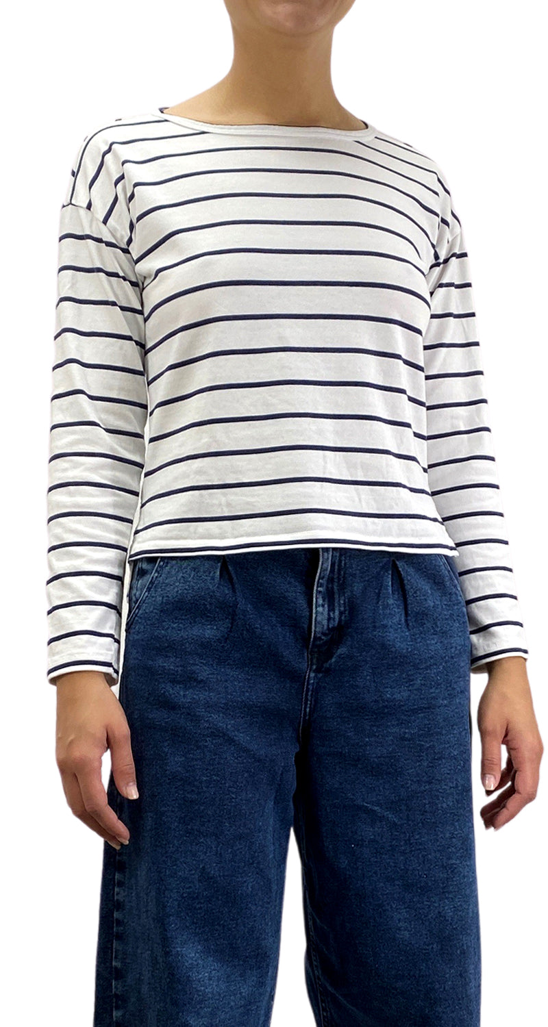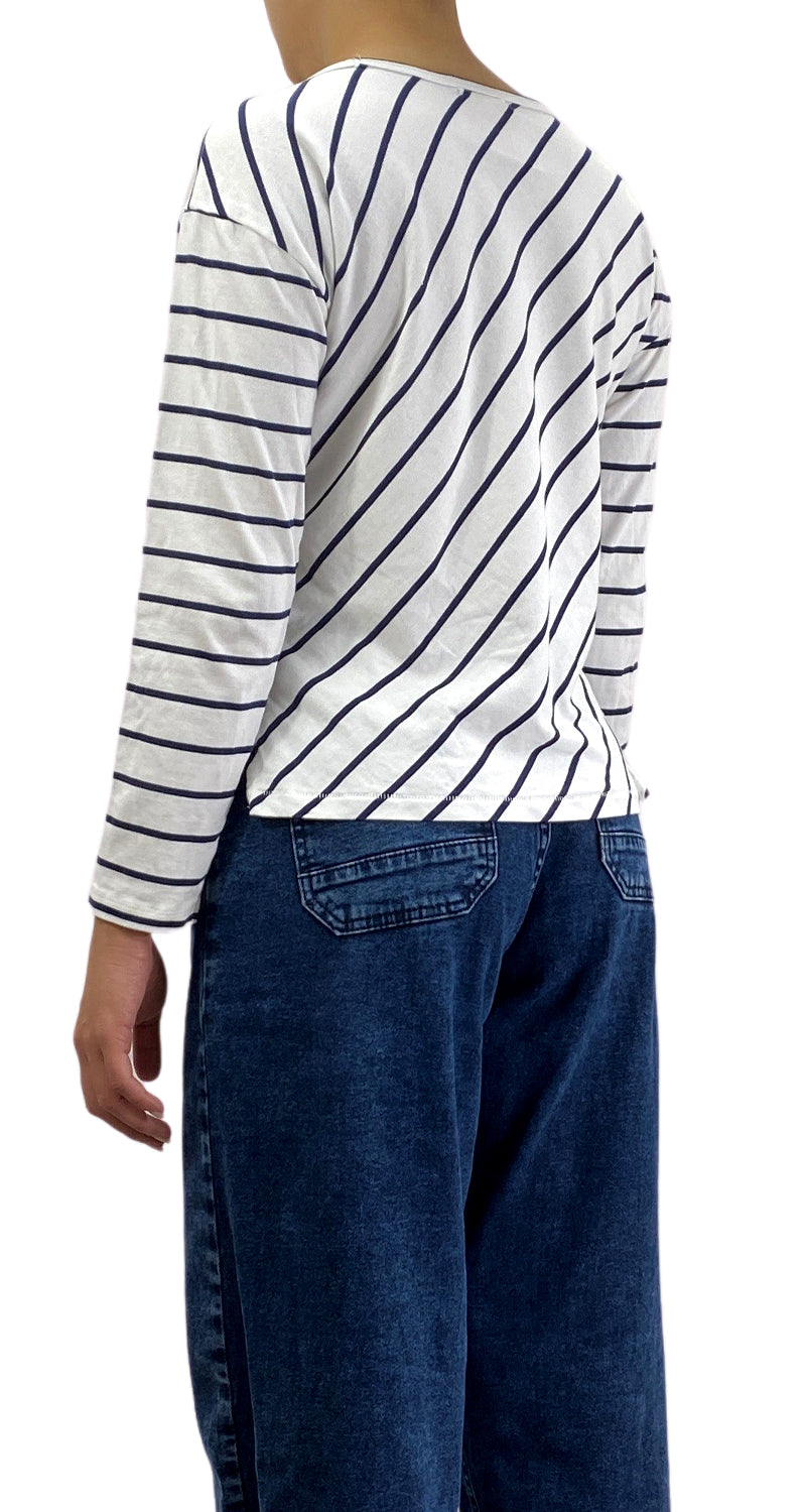 Polera manga larga a rayas en color Blanco y Azul Oscuro, con aberturas en laterales.