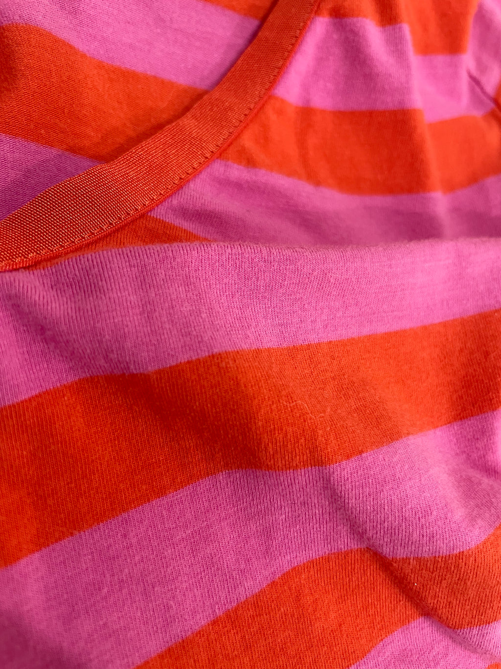 Polera mangas 3/4 de rayas color Naranja y Rosado, cuello V.