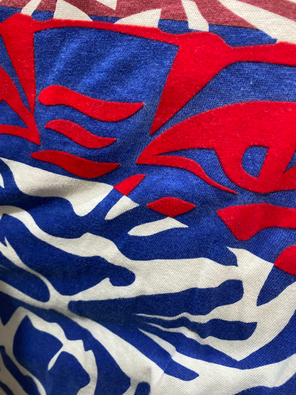 Polera color Beige con estampado multicolor y detalle de relieve en delantero, presenta leves signos de uso. Talla 2 de la marca.