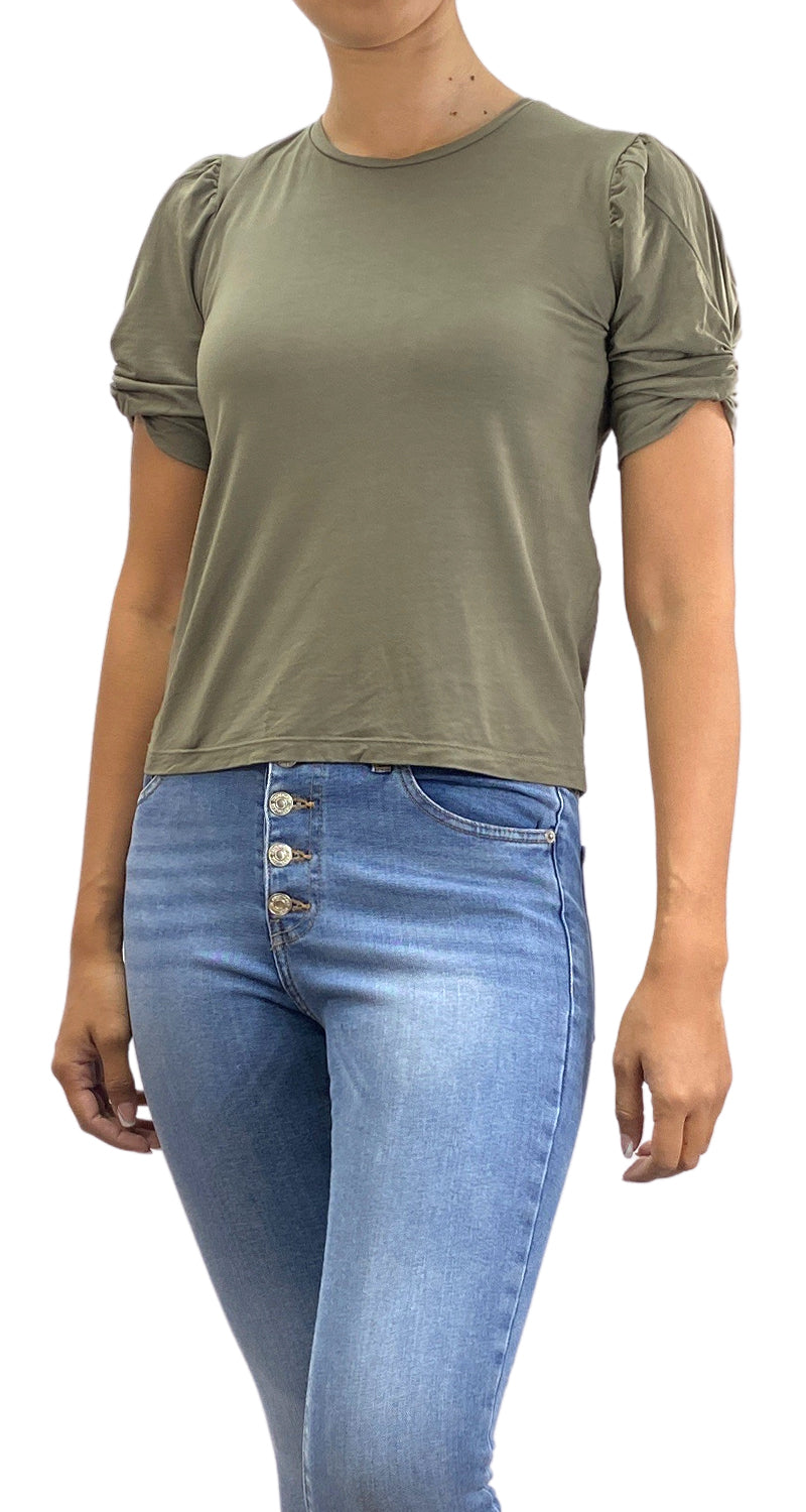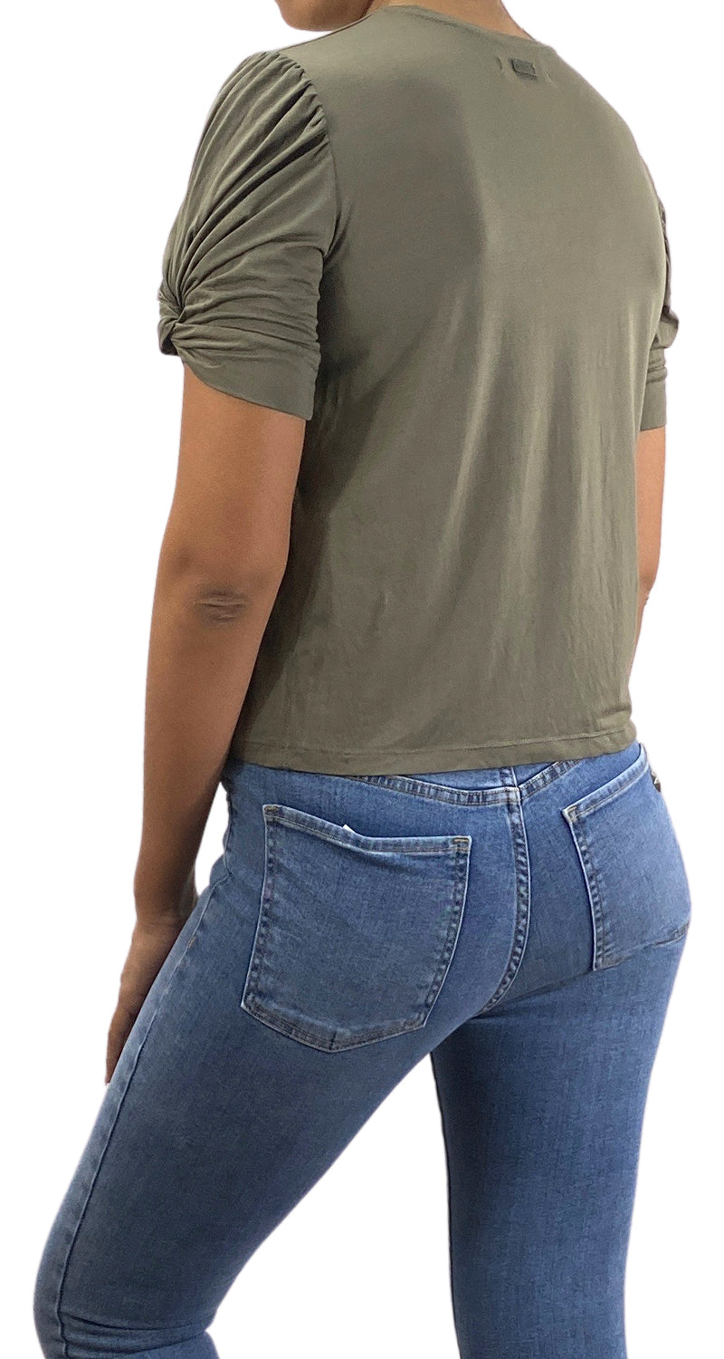 Blusa color Verde Militar con hombros plisados y nudos en mangas. Talla 1 de la marca.
