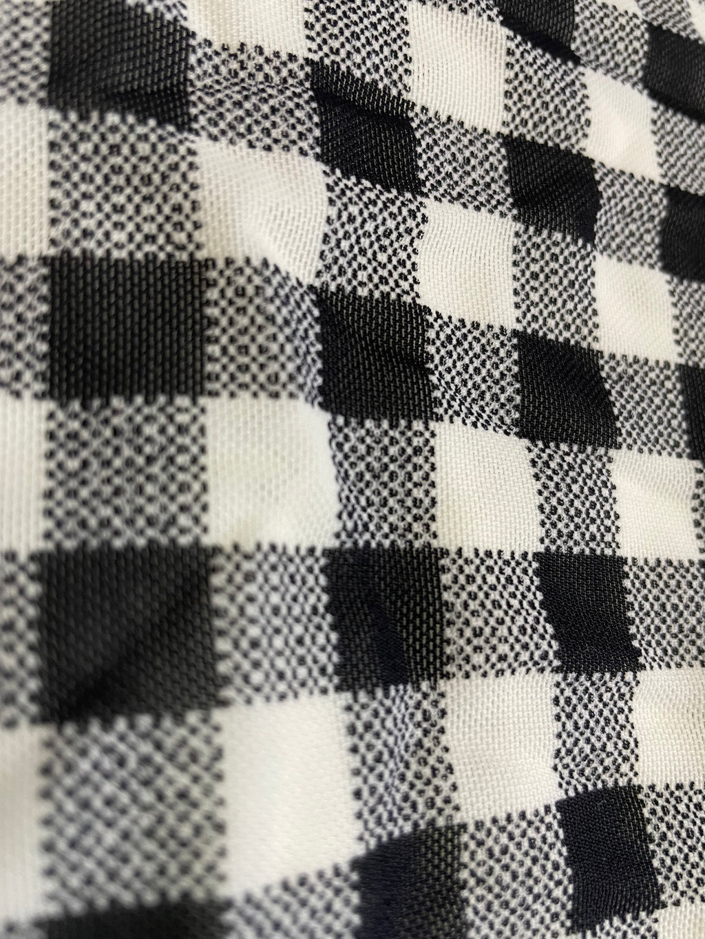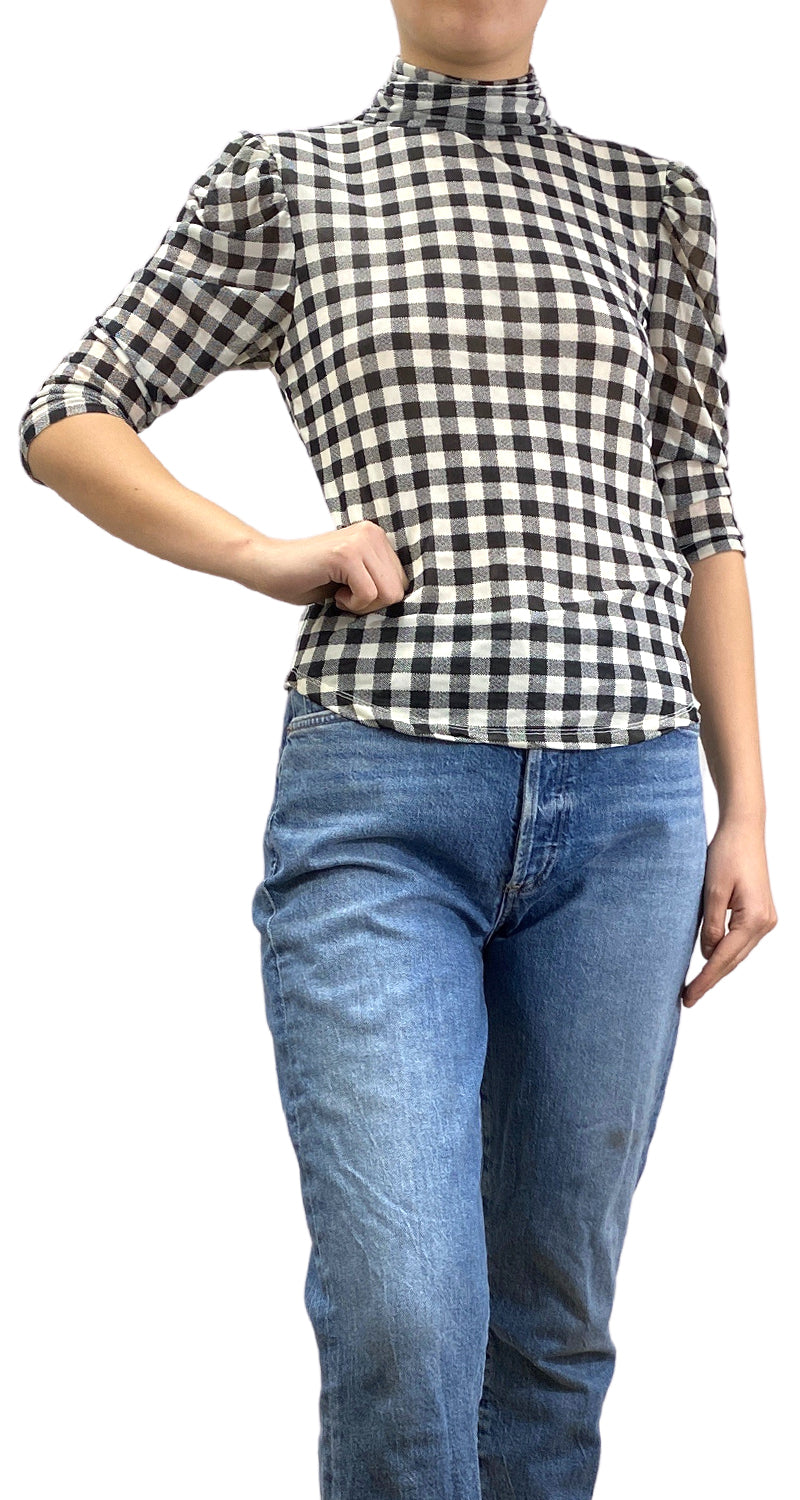 Polera a cuadros en Blanco y Negro, cuello tortuga con mangas 3/4 traslucidas y plises en hombros.