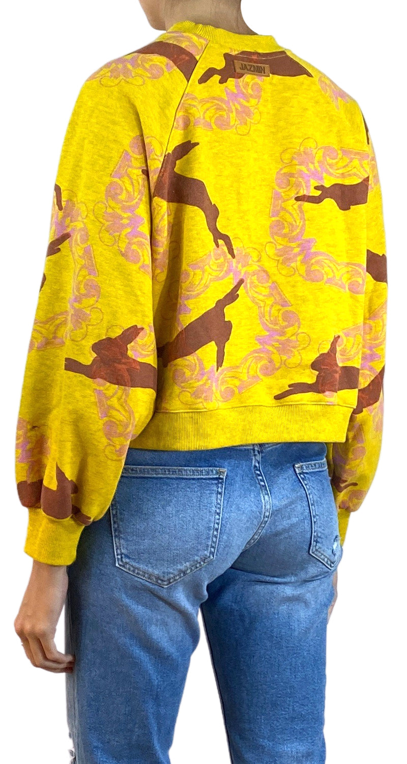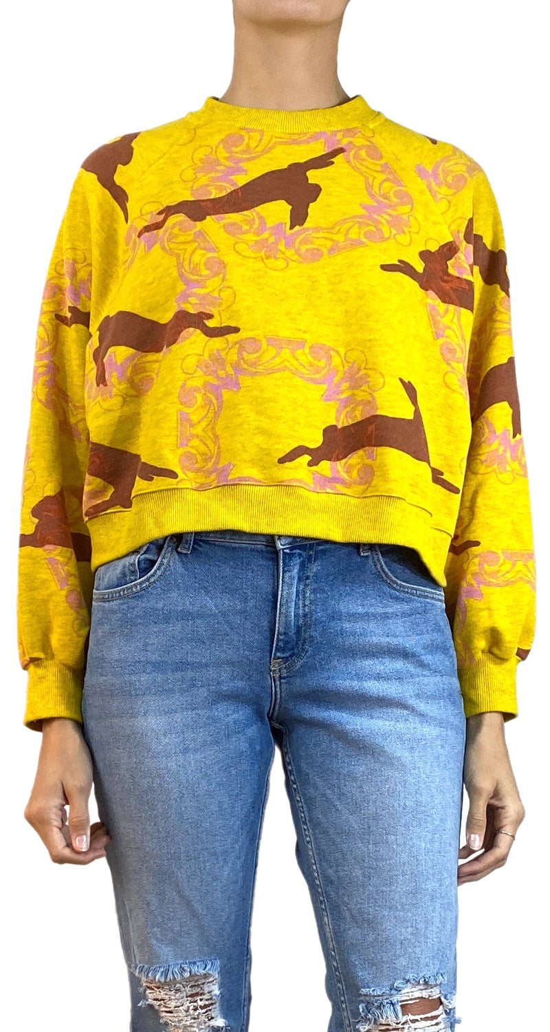 Polerón color Amarillo con estampado Rosado y conejos en Café. Talla 1 de la marca.