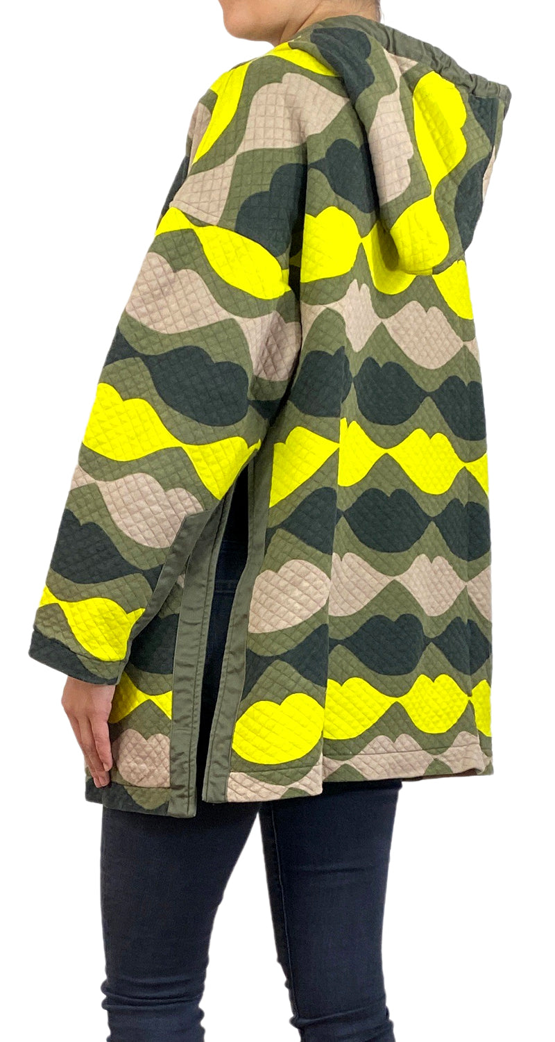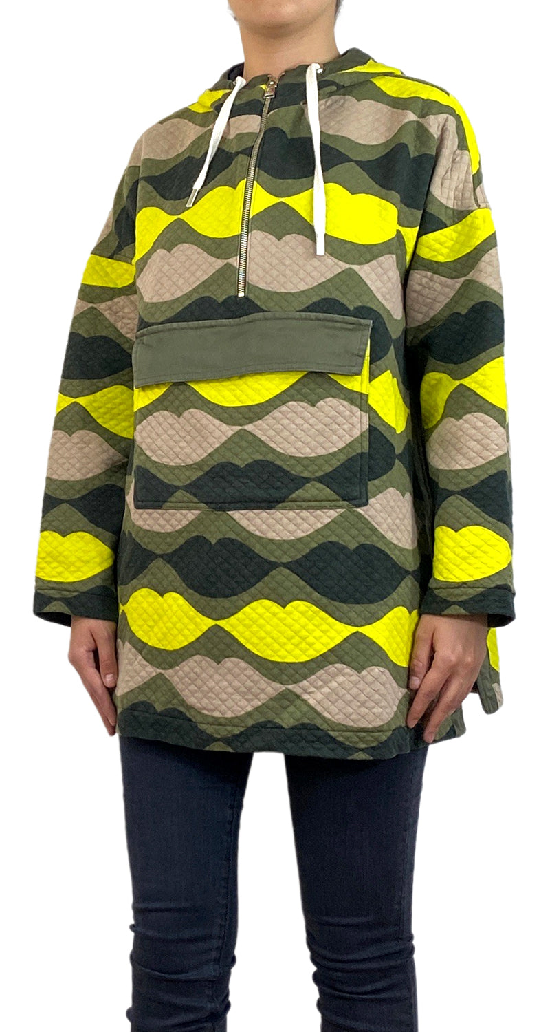 Polerón canguro estampado en tonos Verdes, Amarillo y Beige, cierre delantero, con capucha y gran abertura en laterales, Talla 2 de la marca.