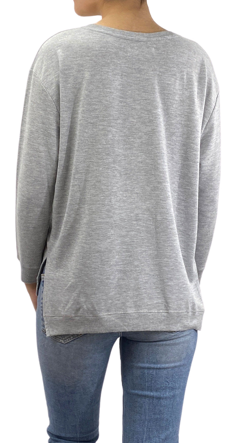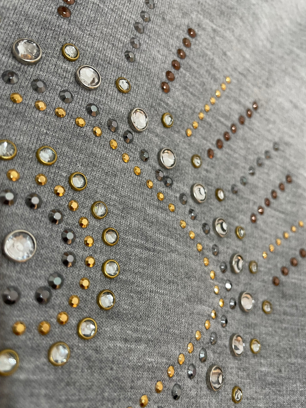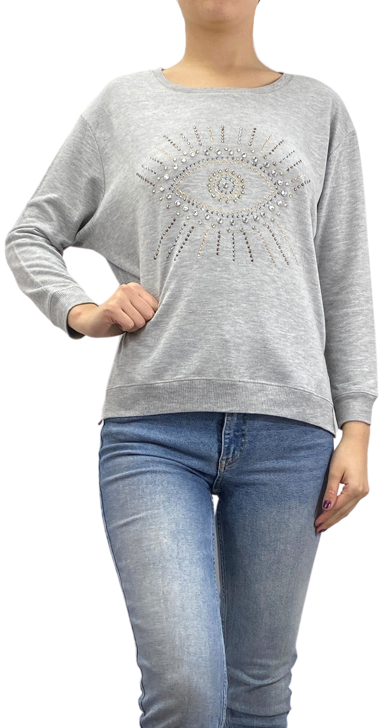Polerón Gris con figura de ojo hecho con piedras. Tiene abertura a los costados, mas largo de espalda.