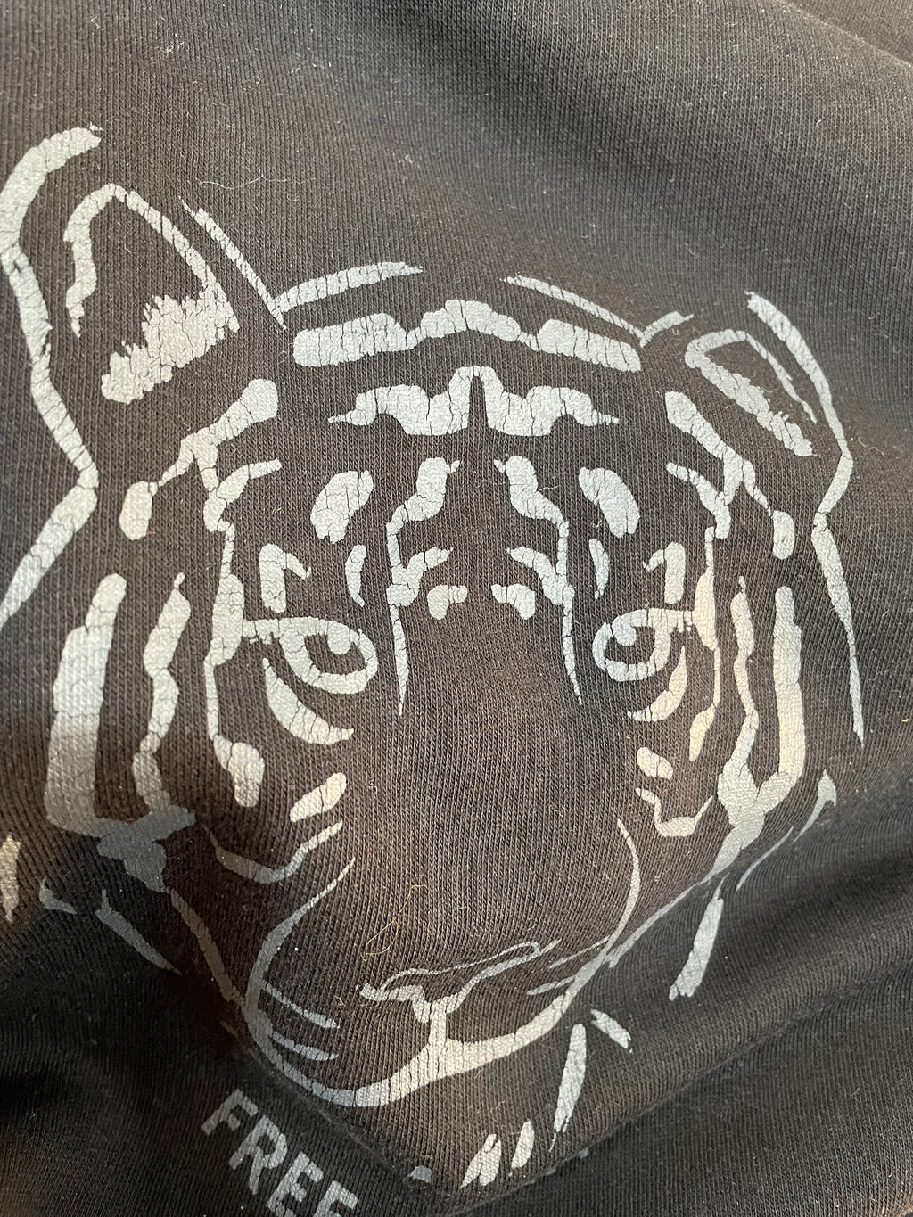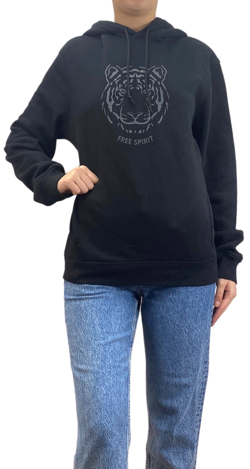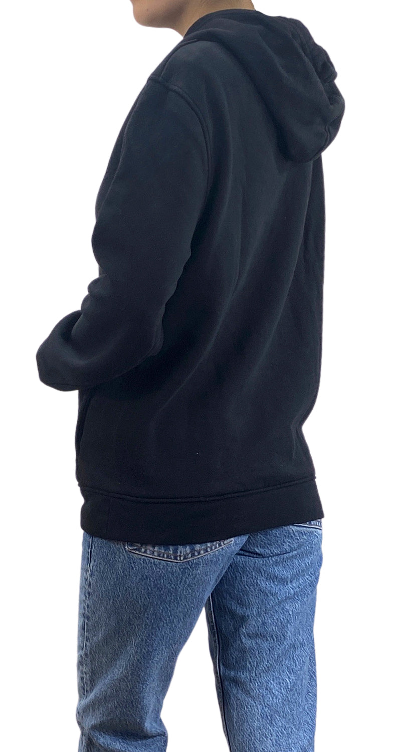 Polerón con capucha color Negro con estampado frontal en Gris, bolsillos laterales. No especifica talla.