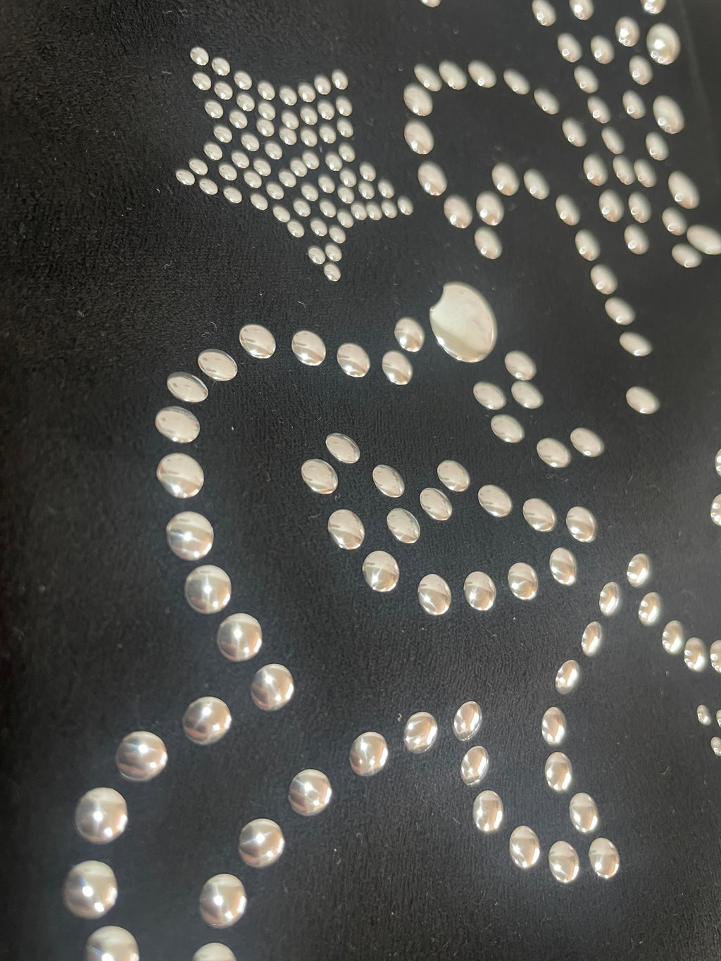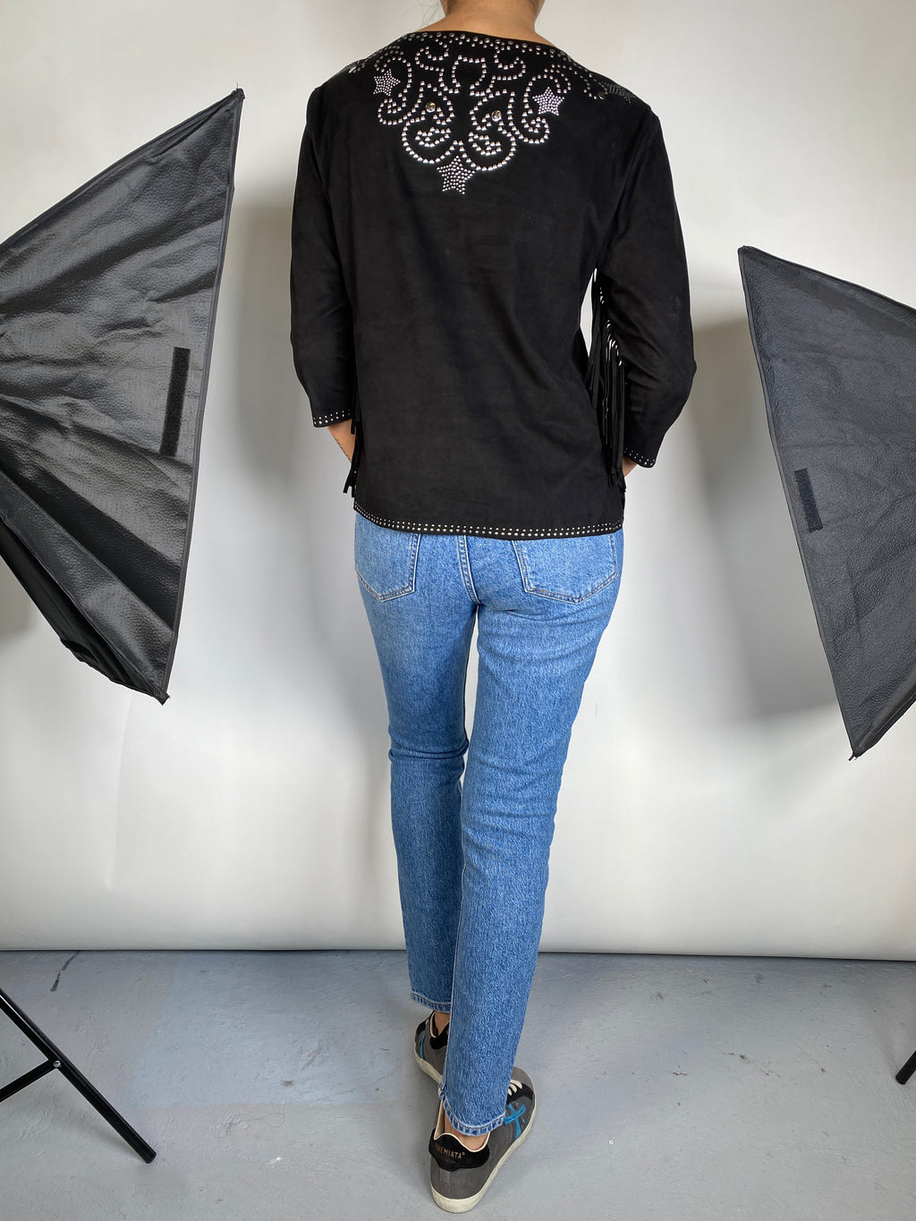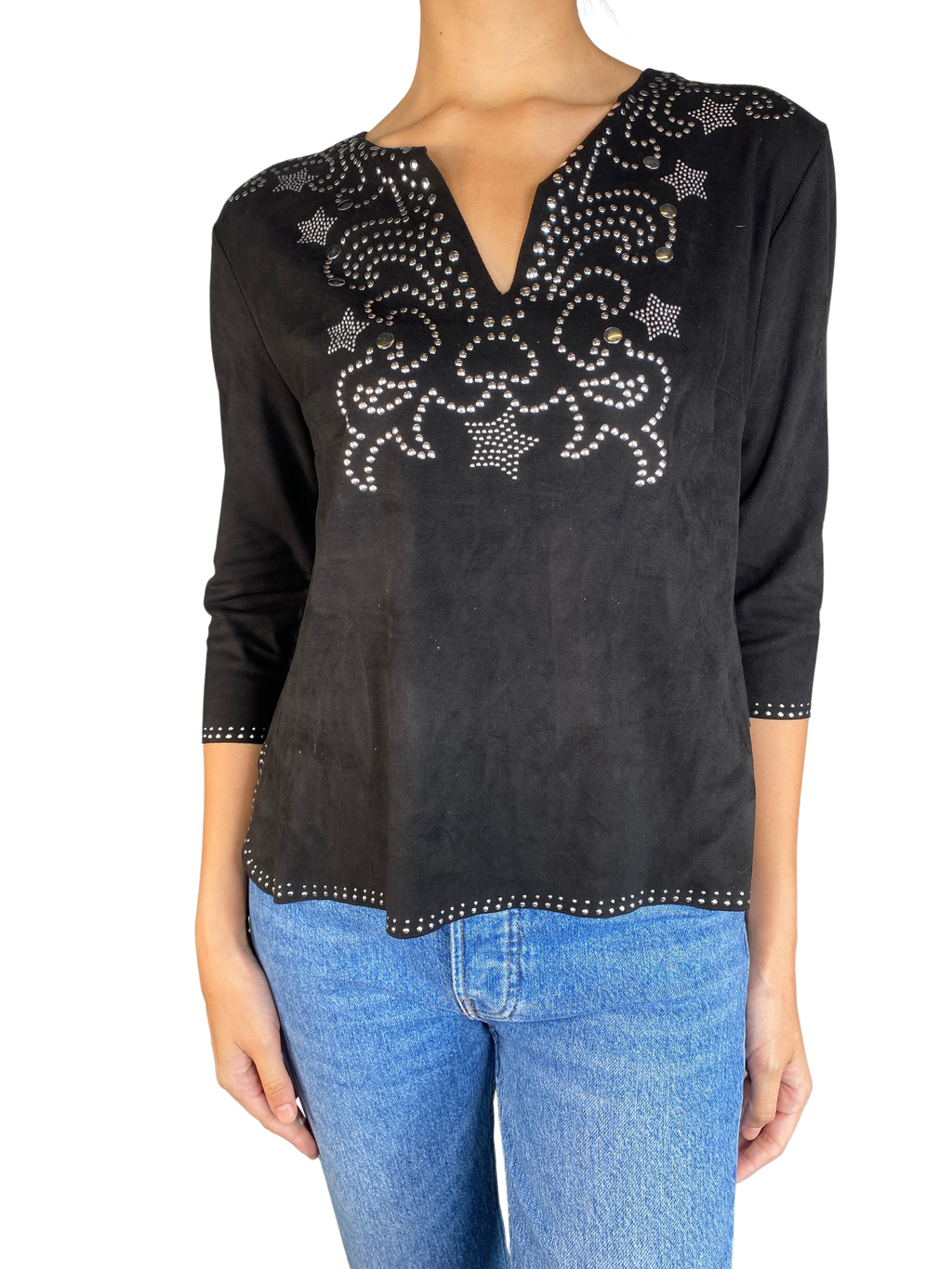 Polerón escote en V efecto gamuza con aplicaciones metálicas y flecos en mangas.