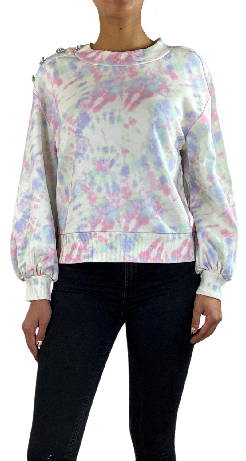Polerón con estampado Tie Dye, aplicaciones de brillantes en hombro.